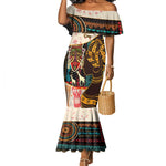 Design: Off-the-shoulder design with a body-hugging fit that flares out at the bottom, creating a stunning mermaid silhouette. Features vibrant, intricate patterns as shown in the pictures.