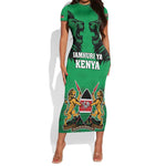 Afro Kenya National Heroes Day Short Sleeve Bodycon Dress Mashujaa With Lion Head And Coat Of Arms