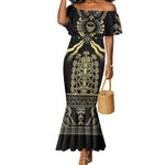 Design: Off-the-shoulder design with a body-hugging fit that flares out at the bottom, creating a stunning mermaid silhouette. Features vibrant, intricate patterns as shown in the pictures.