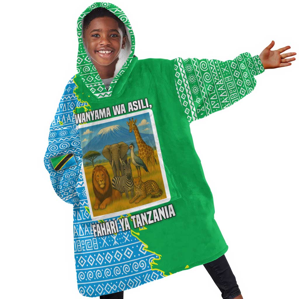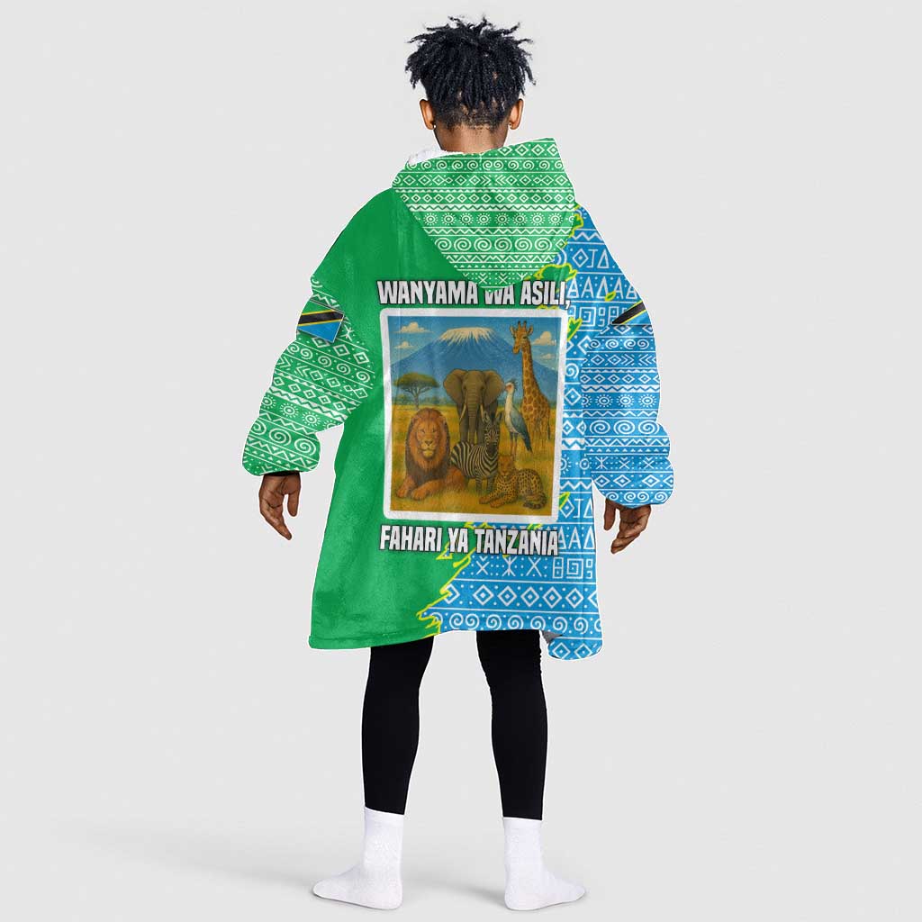Tanzania Wildlife Kid Wearable Blanket Hoodie - Tribal Print and Mount Kilimanjaro Safari Scene