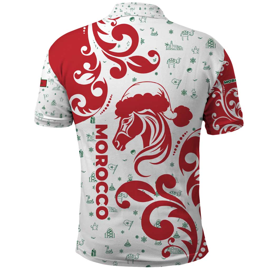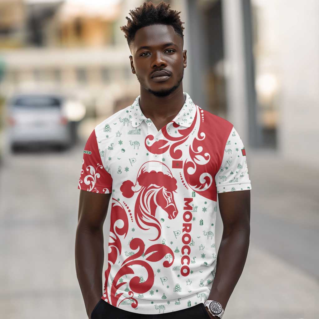 Morocco Christmas Polo Shirt Red Horse Santa Hat Arabesque Pattern a