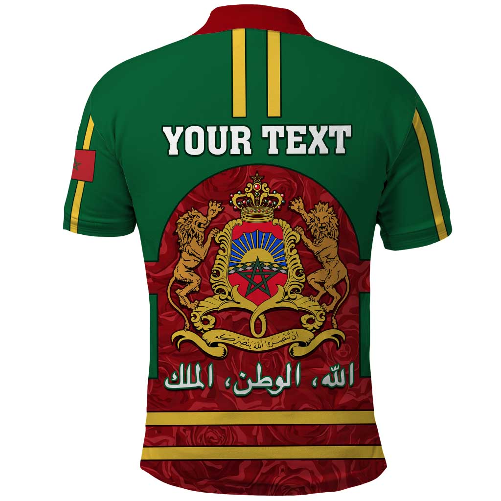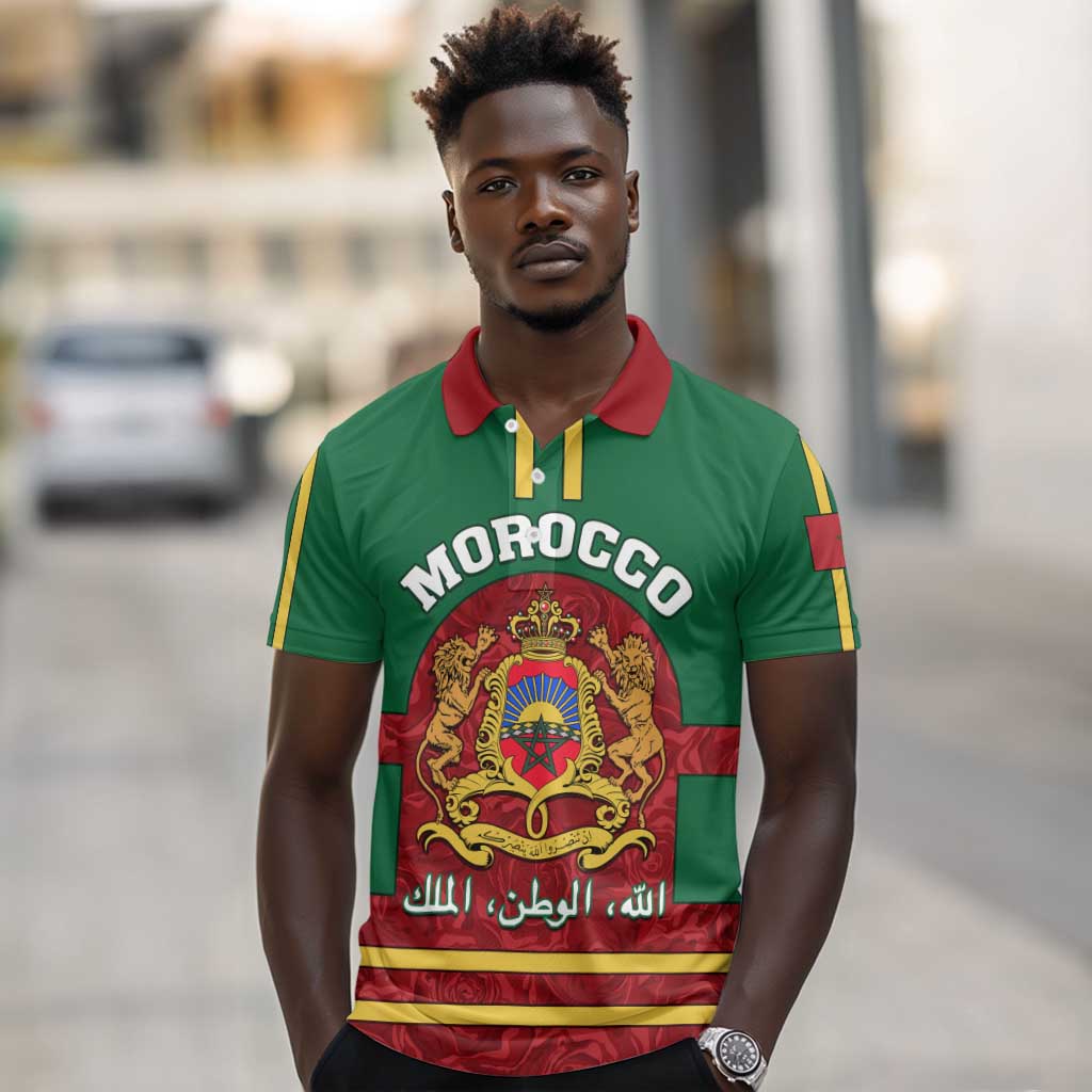 Morocco Proclamation Day Polo Shirt with Marruecos Coat of Arms and Roses Pattern