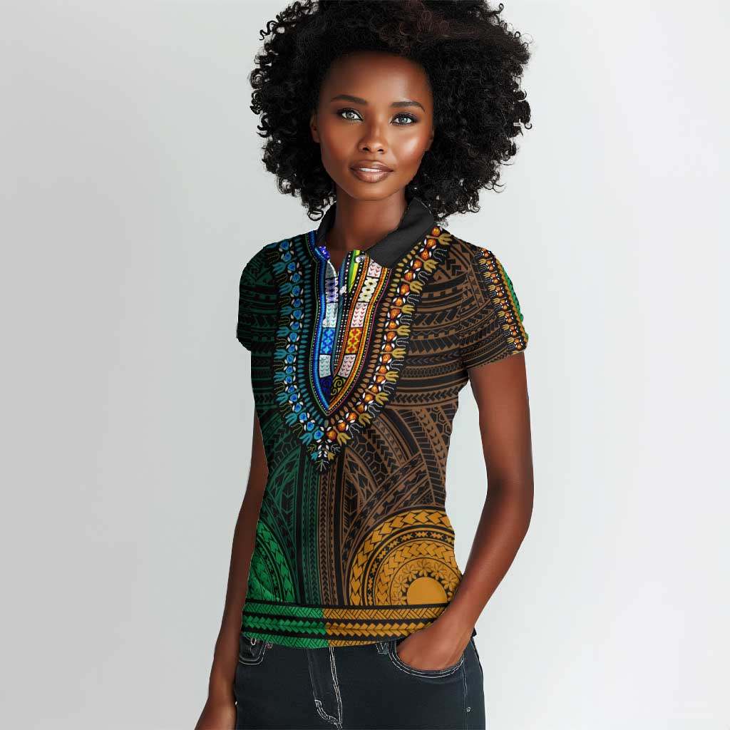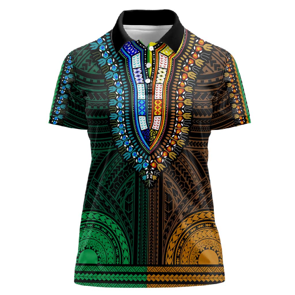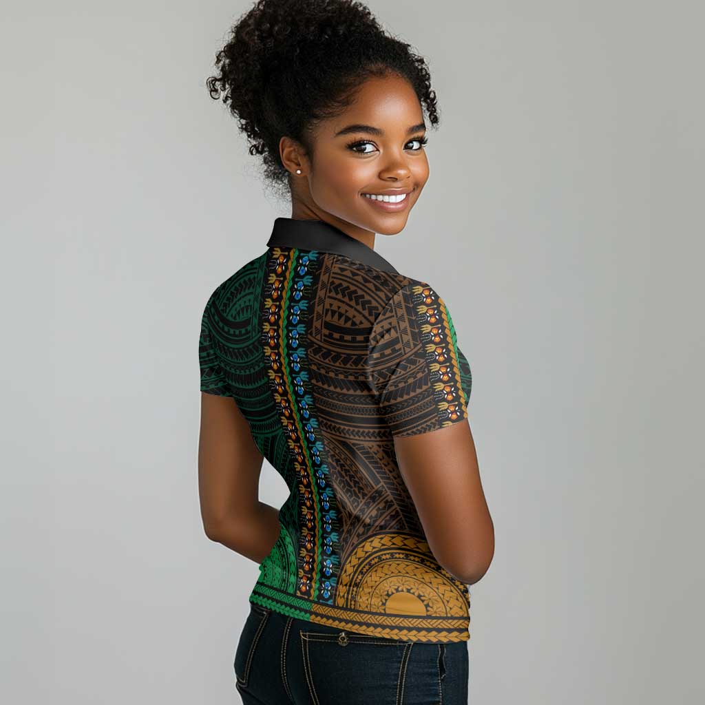 African Dashiki and Polynesian Pattern Women Polo Shirt Half Green-Gold