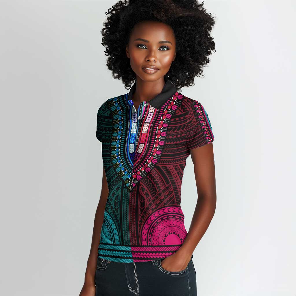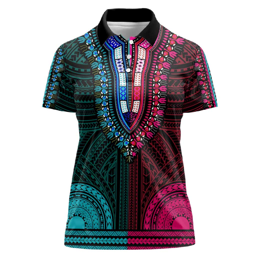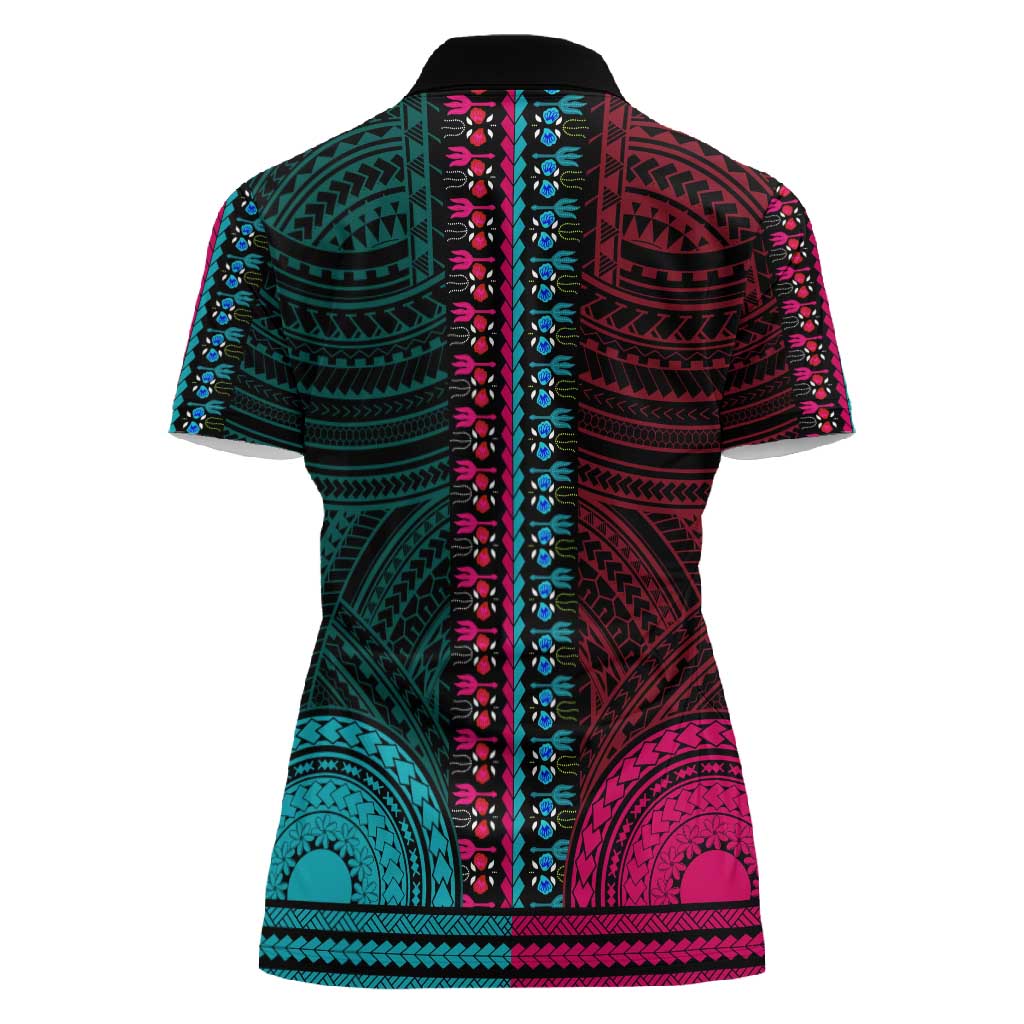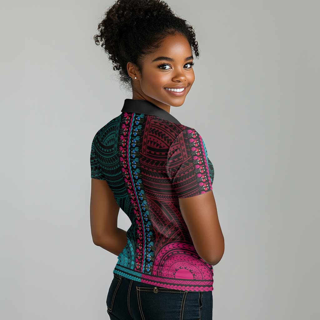 African Dashiki and Polynesian Pattern Women Polo Shirt Half Teal-Pink