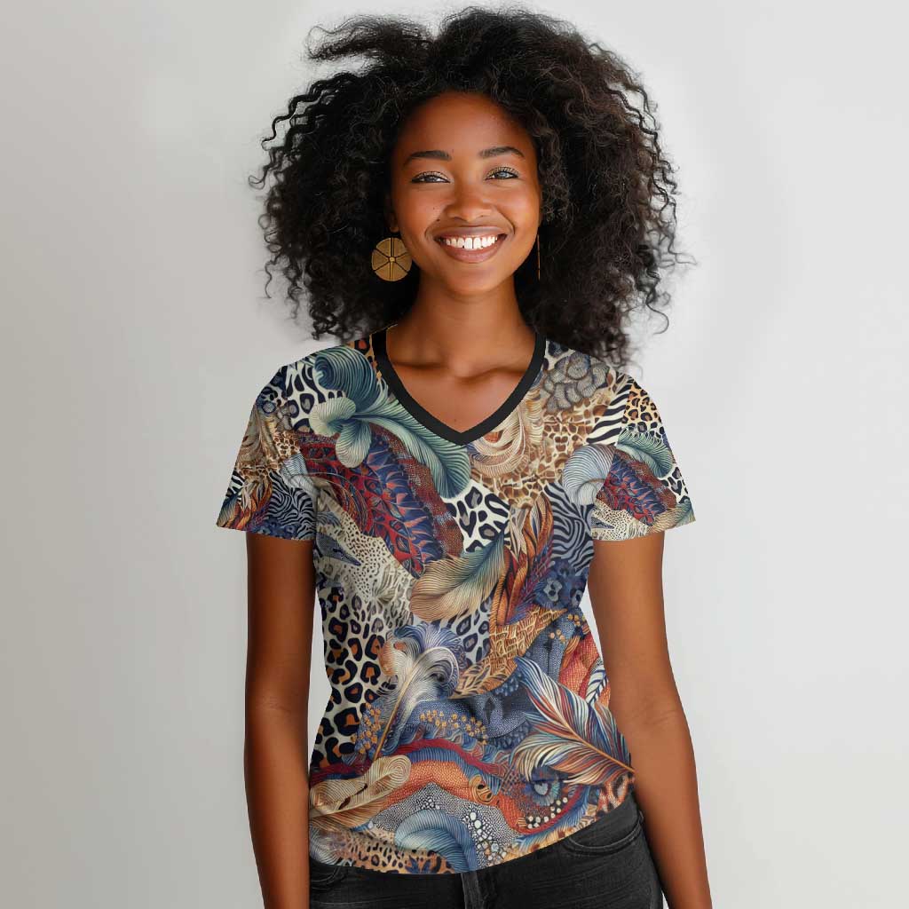 African Wild Animal Skins Women V-Neck T-Shirt Unique Leopard Zebra And Snake Patterns