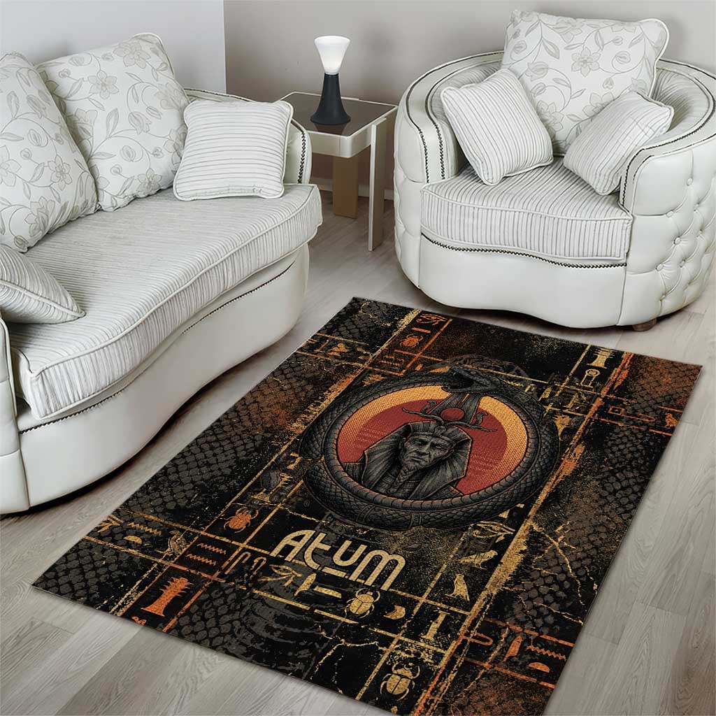 Atum Ancient Egyptian Area Rug with Dark Hieroglyph Grid, Ouroboros Serpent Ring and The Final Serpent
