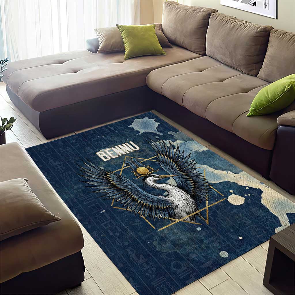 Bennu Ancient Egyptian Area Rug with Deep Blue Ink Wash, Winged Bennu Bird and Soul of Ra