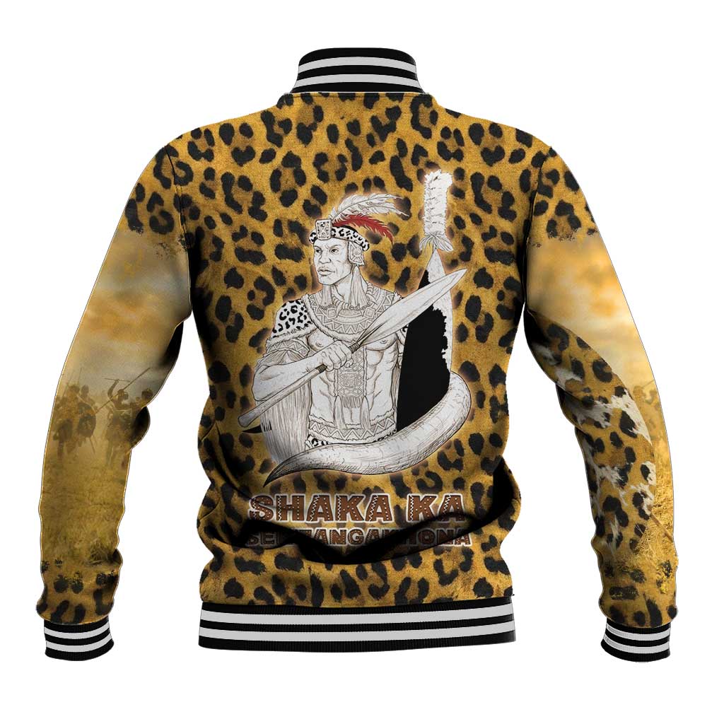 Shaka Zulu Baseball Jacket Leopard Print Design Traditional Warrior Spear and Shield Illustration Tribal King