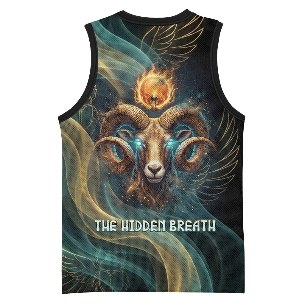 Amun Ancient Egyptian Basketball Jersey with Mystical Smoke Swirl Pattern, Fiery Ram Head, and Hieroglyphic