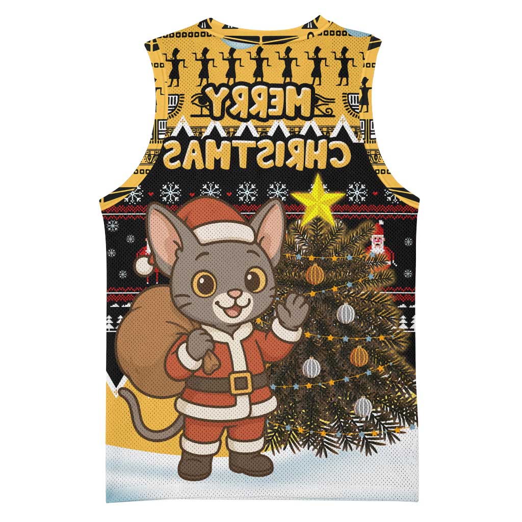 Egypt Christmas Basketball Jersey Santa Cat Sleigh Reindeer Christmas Tree and Ancient Hieroglyphic