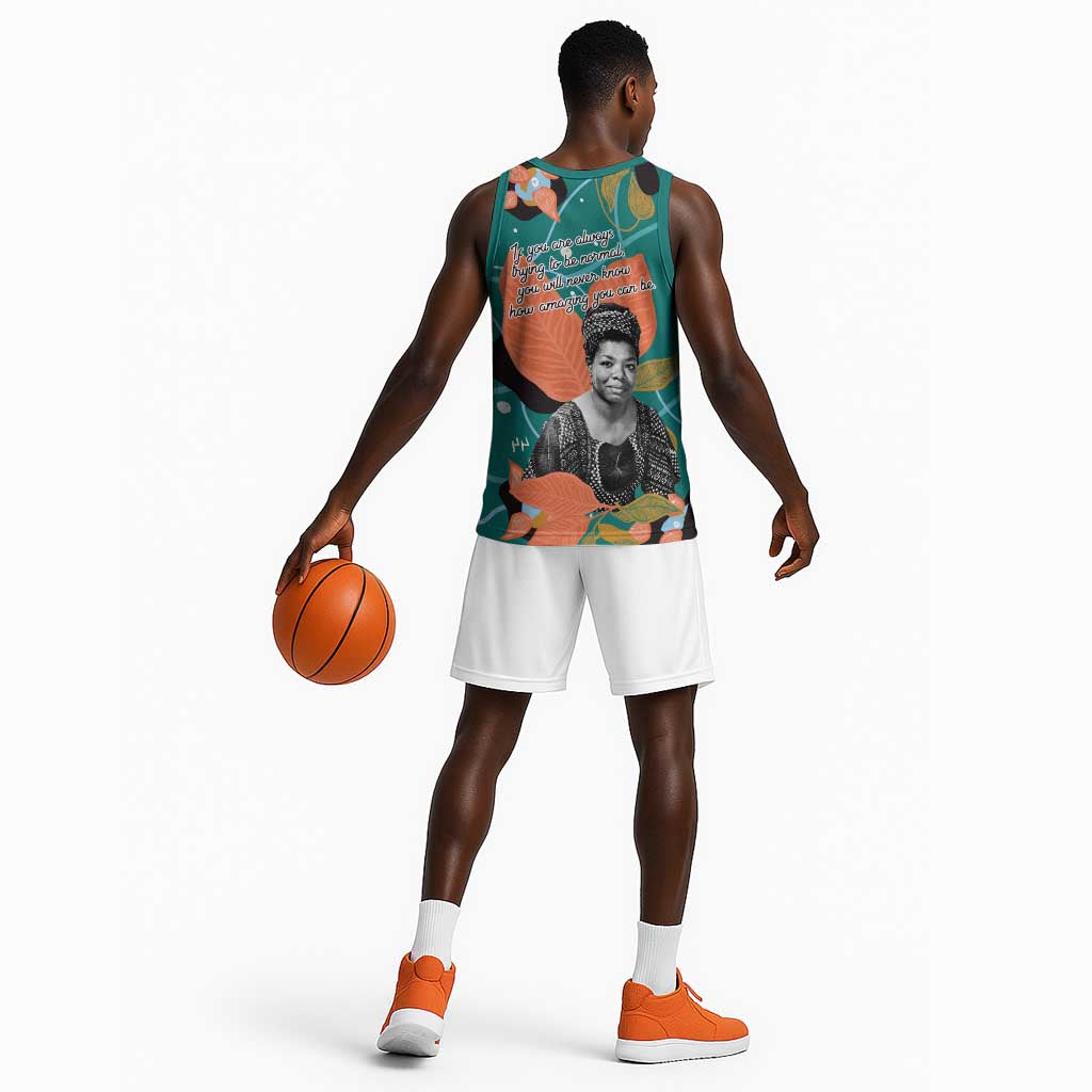 Maya Angelou Basketball Jersey Inspirational Quote Design Vibrant Teal and Orange Leaf Motif