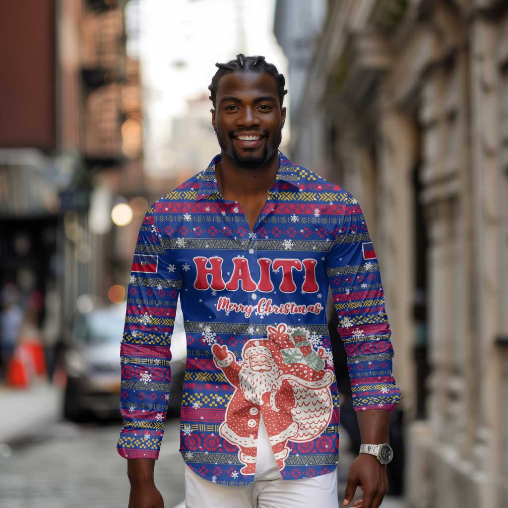 Haiti Christmas Long Sleeve Button Shirt Blue Red Xmas Santa Snowflake and Map TS04