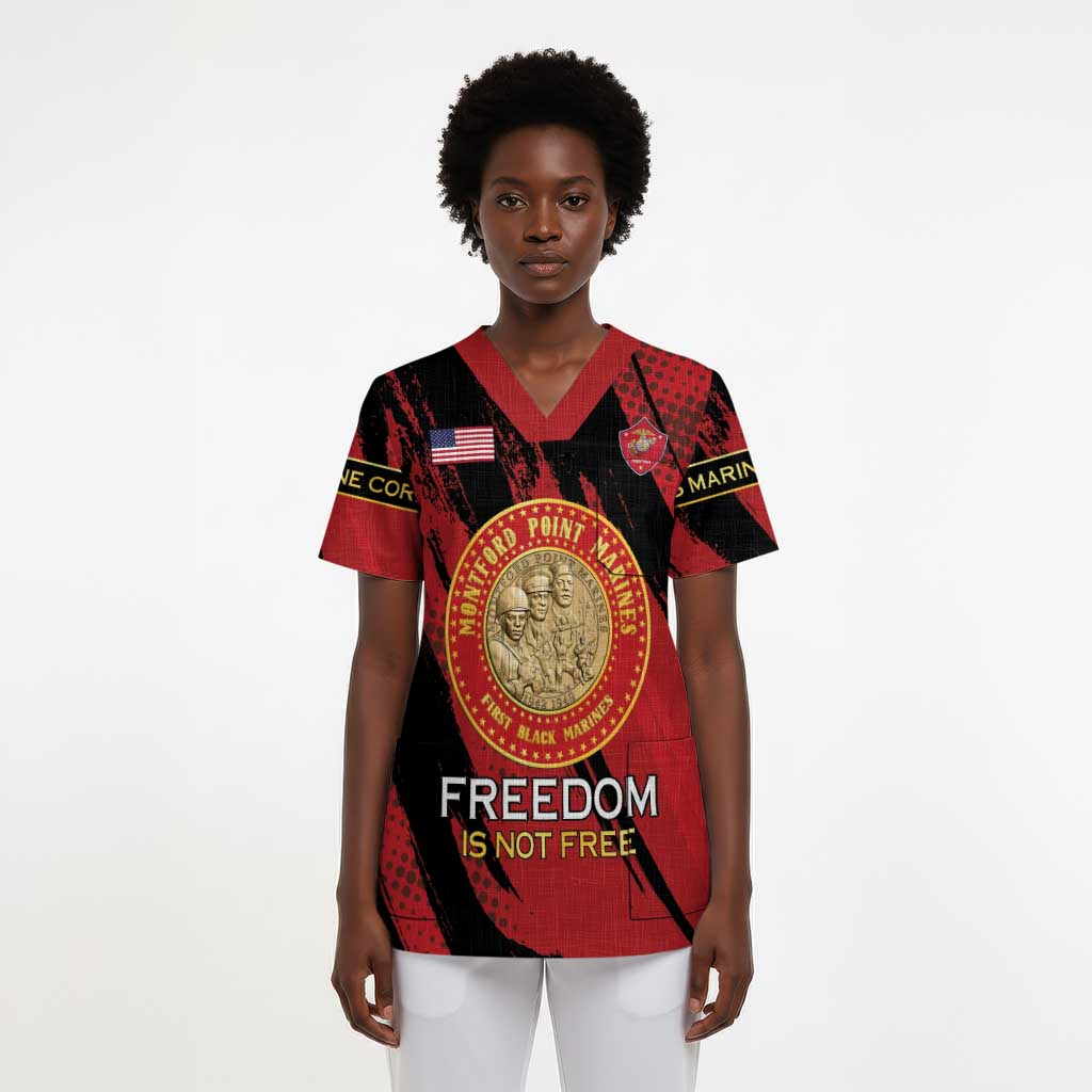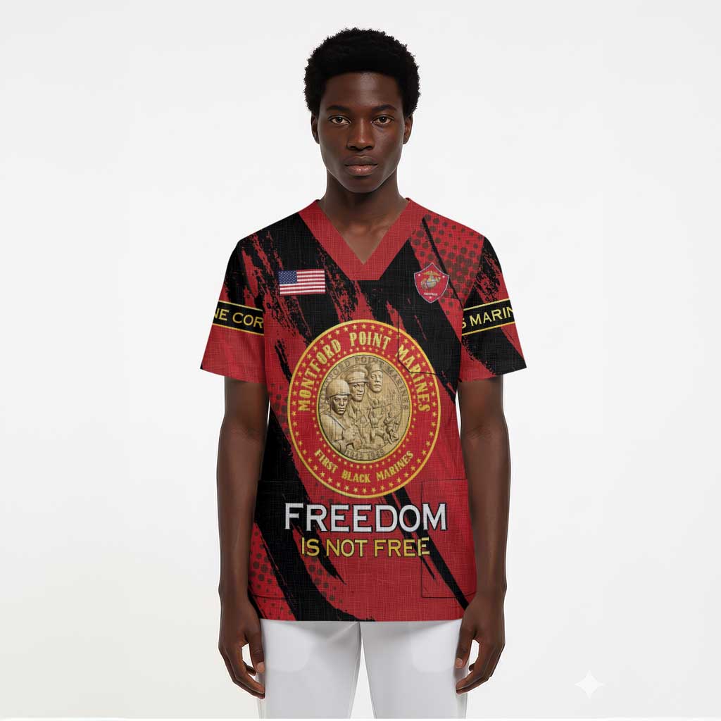 Elevate your workwear today — order your African Pride Personalized Honoring the First Black Marines Scrub Top Montford Point Heroes - Red Scrub Top and experience the perfect balance of comfort, quality, and pride.