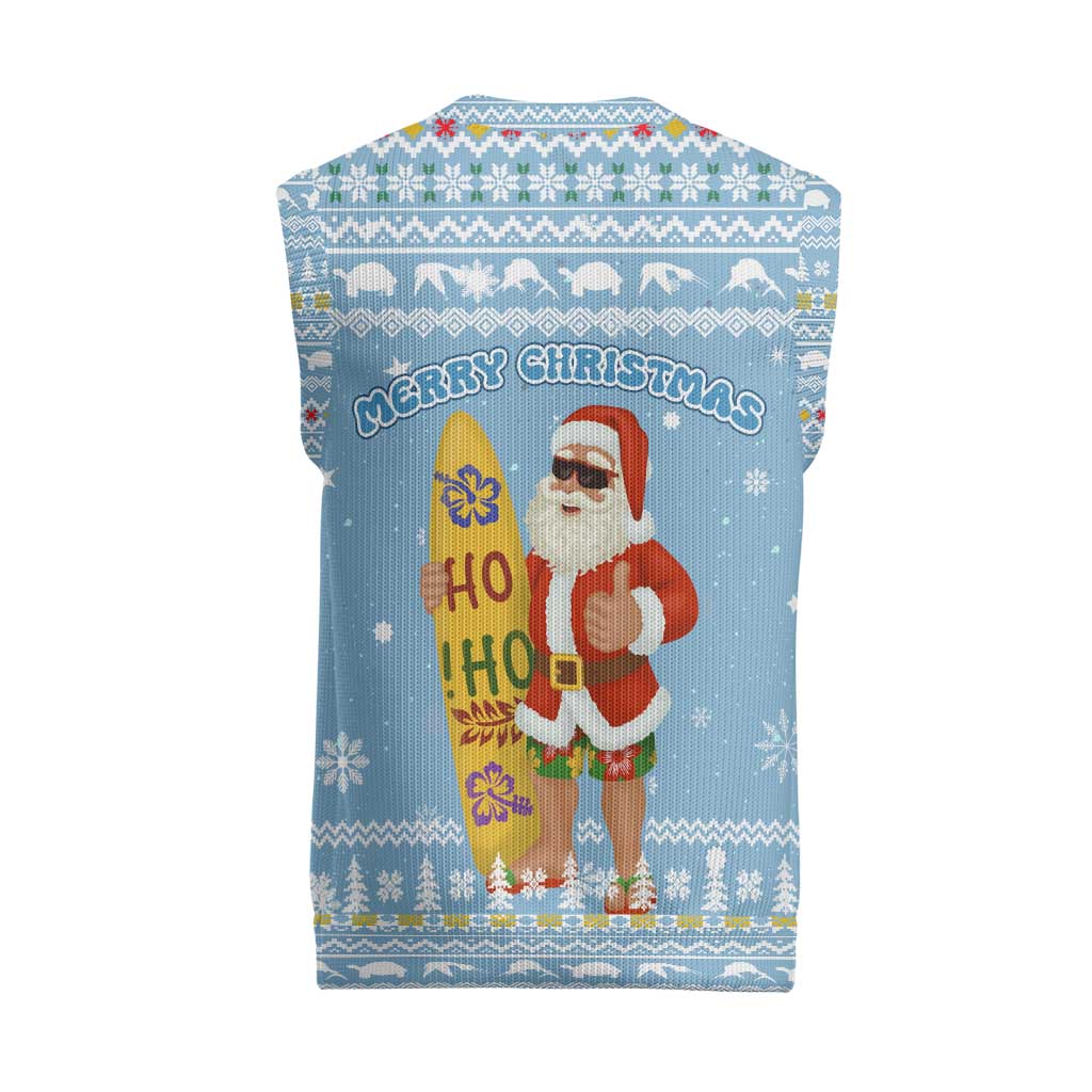 Seychelles Christmas Knitted V-Neck Vest Ocean Blue Marlin Fish Artwork and Surfing Santa Motif
