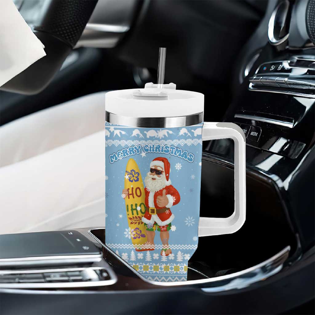 Seychelles Christmas Tumbler With Handle Ocean Blue Marlin Fish Artwork and Surfing Santa Motif