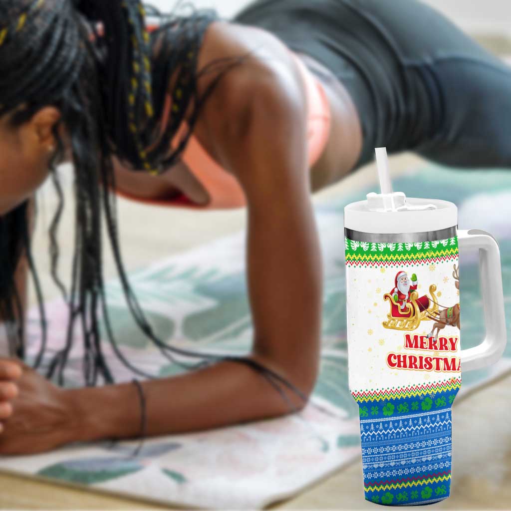 Sierra Leone Christmas Tumbler With Handle Festive Pattern Golden Lion Emblem and Santa Sleigh