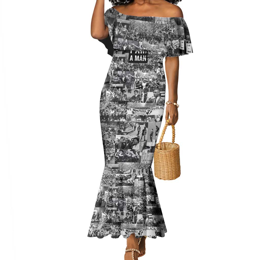 Design: Off-the-shoulder design with a body-hugging fit that flares out at the bottom, creating a stunning mermaid silhouette. Features vibrant, intricate patterns as shown in the pictures.