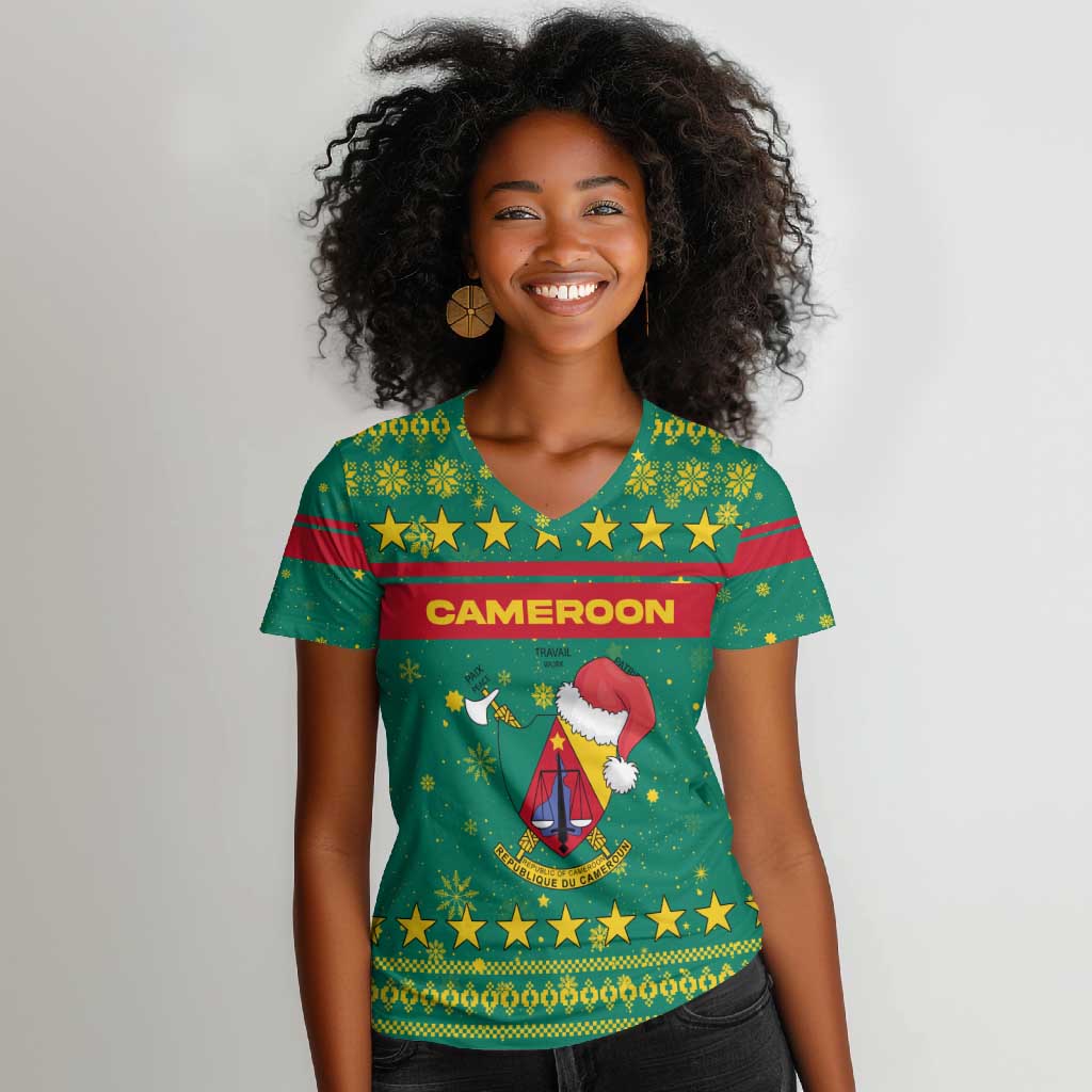 Cameroon Christmas Women V-Neck T-Shirt Coat of Arms Santa Hat and Stars Motif TS04