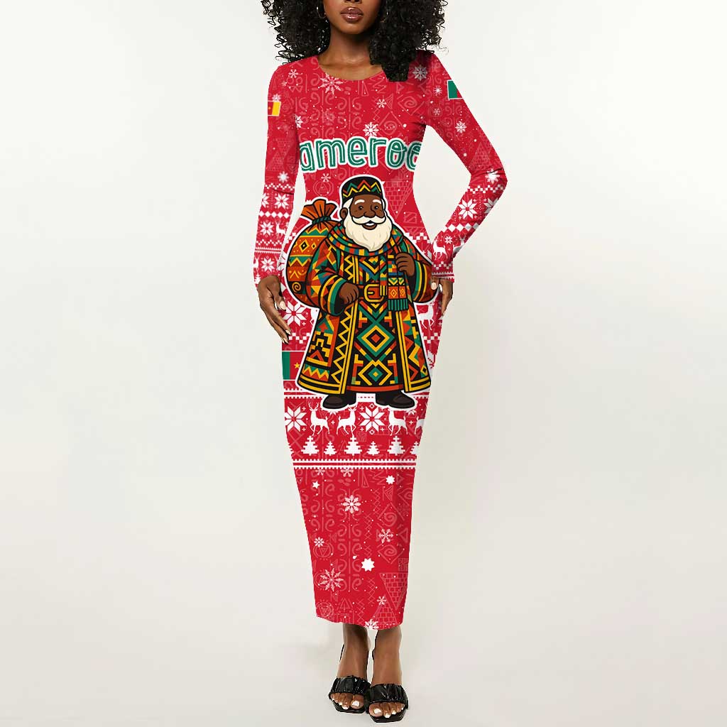Cameroon Christmas Long Sleeve Bodycon Dress Snowflake Pattern Traditional Santa and Map Motif