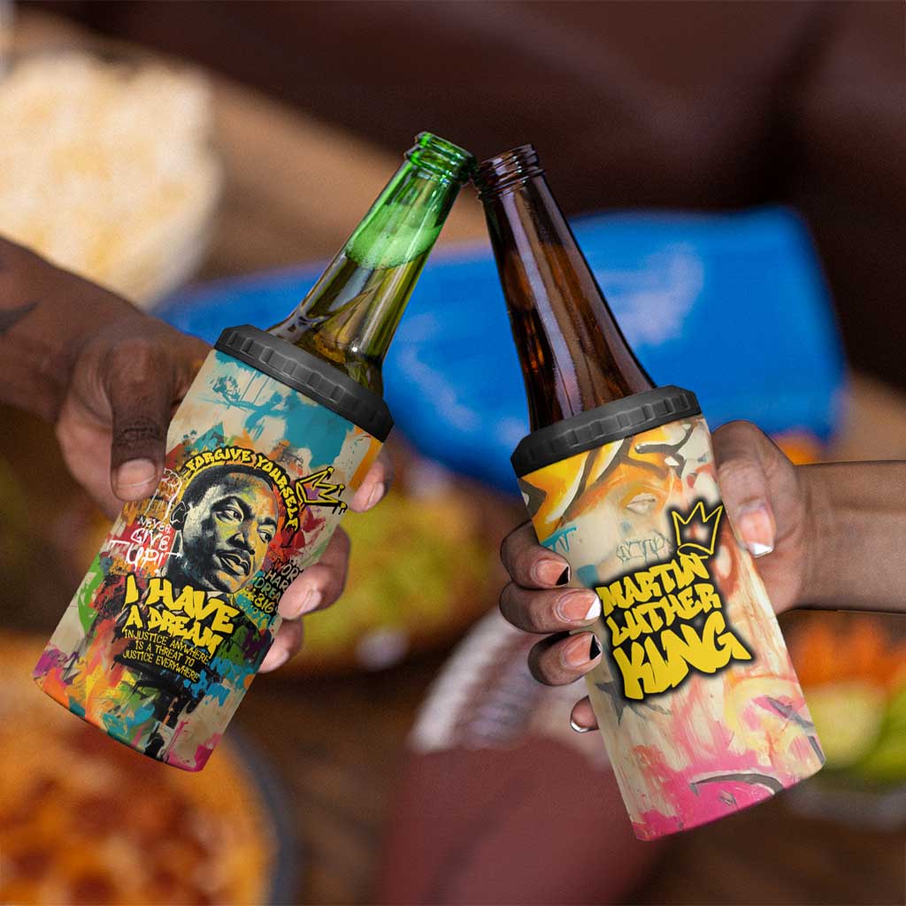 Martin Luther King Graffiti Afro 4 in 1 Can Cooler Tumbler Colorful Spray Paint Quotes and Crown