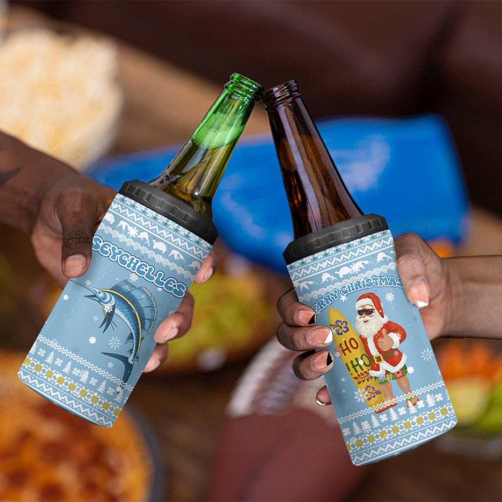 Seychelles Christmas 4 in 1 Can Cooler Tumbler Ocean Blue Marlin Fish Artwork and Surfing Santa Motif