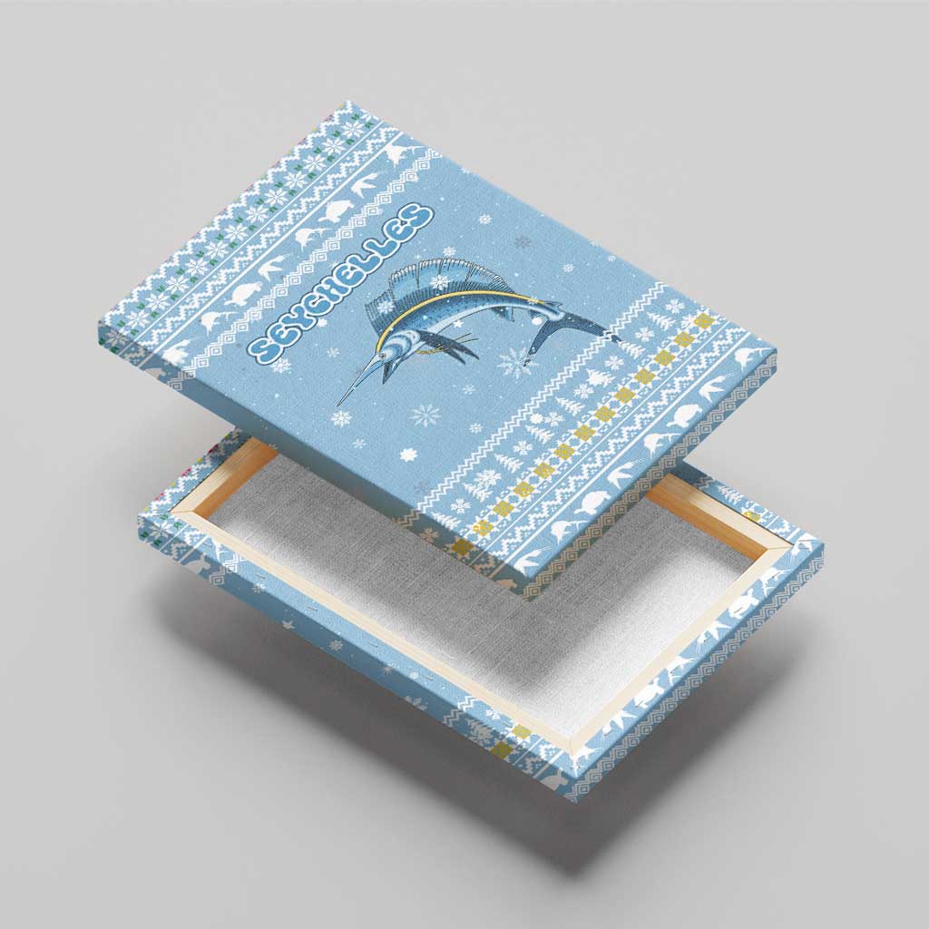 Seychelles Christmas Canvas Wall Art Ocean Blue Marlin Fish Artwork and Surfing Santa Motif