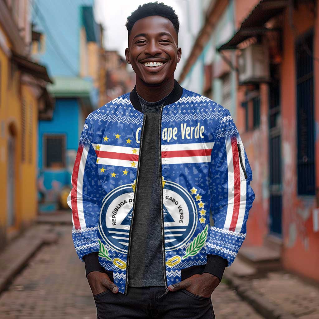 Cape Verde Christmas Sleeve Zip Bomber Jacket Blue Festive Pattern Sailing Santa and National Emblem Motif