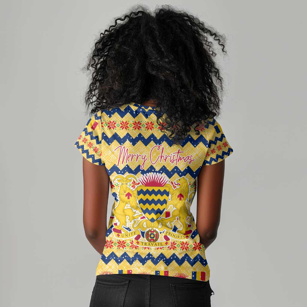 Chad Christmas Women V-Neck T-Shirt National Coat of Arms, and Festive Motif