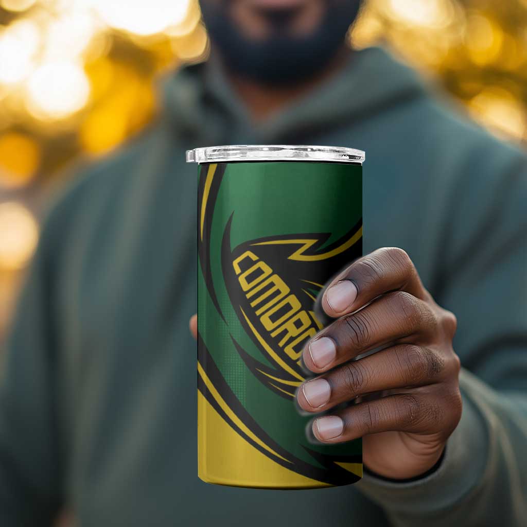 Comoros 4 in 1 Can Cooler Tumbler - Green Black Yellow Swirl Design and National Emblem Pattern