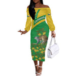 Comoros Off The Shoulder Long Sleeve Dress - National Flag Lemur Design and Ylang Ylang Flower Pattern