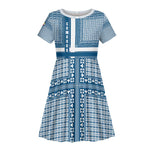 Comoros Kid Short Sleeve Dress - Blue and White Traditional Geometric Pattern and National Flag Detail