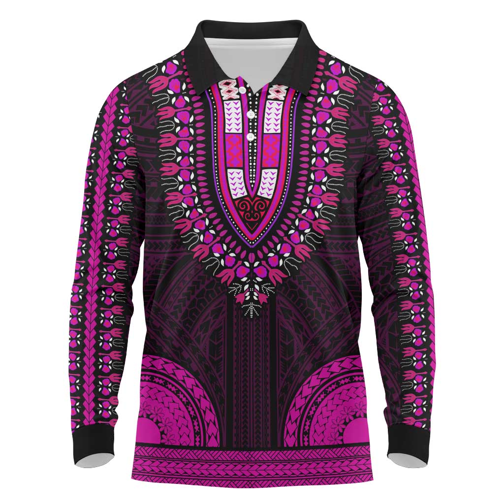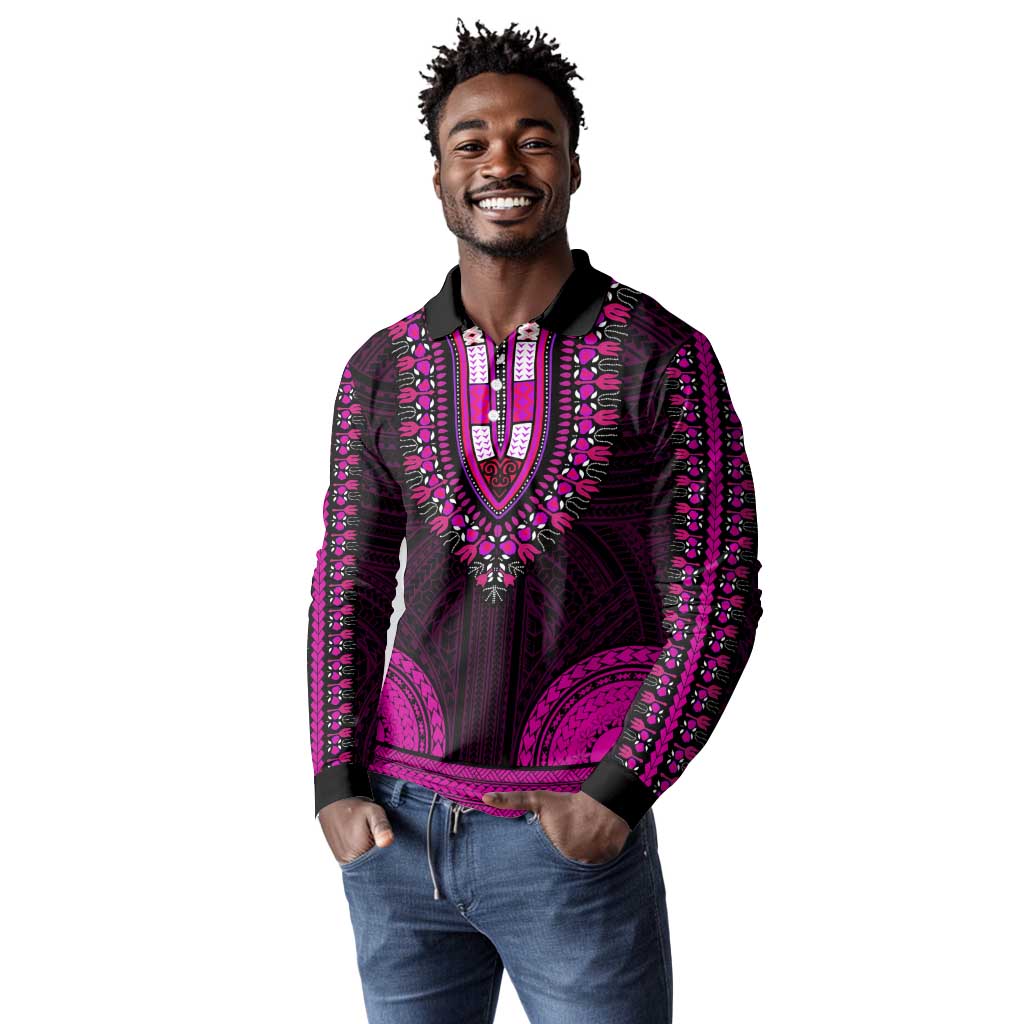 African Dashiki and Polynesian Pattern Long Sleeve Polo Shirt Pink