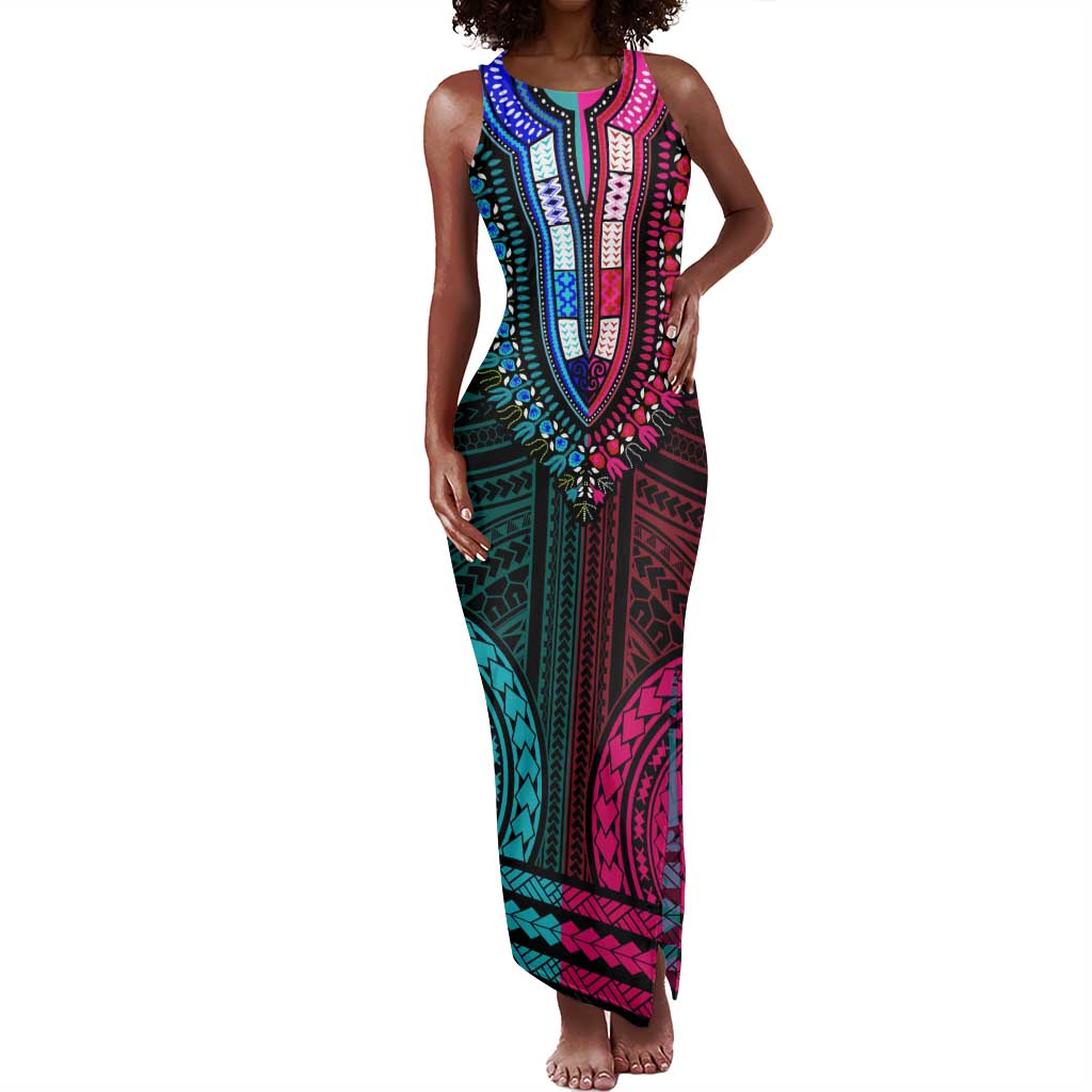 African Dashiki and Polynesian Pattern Tank Maxi Dress Half Teal-Pink