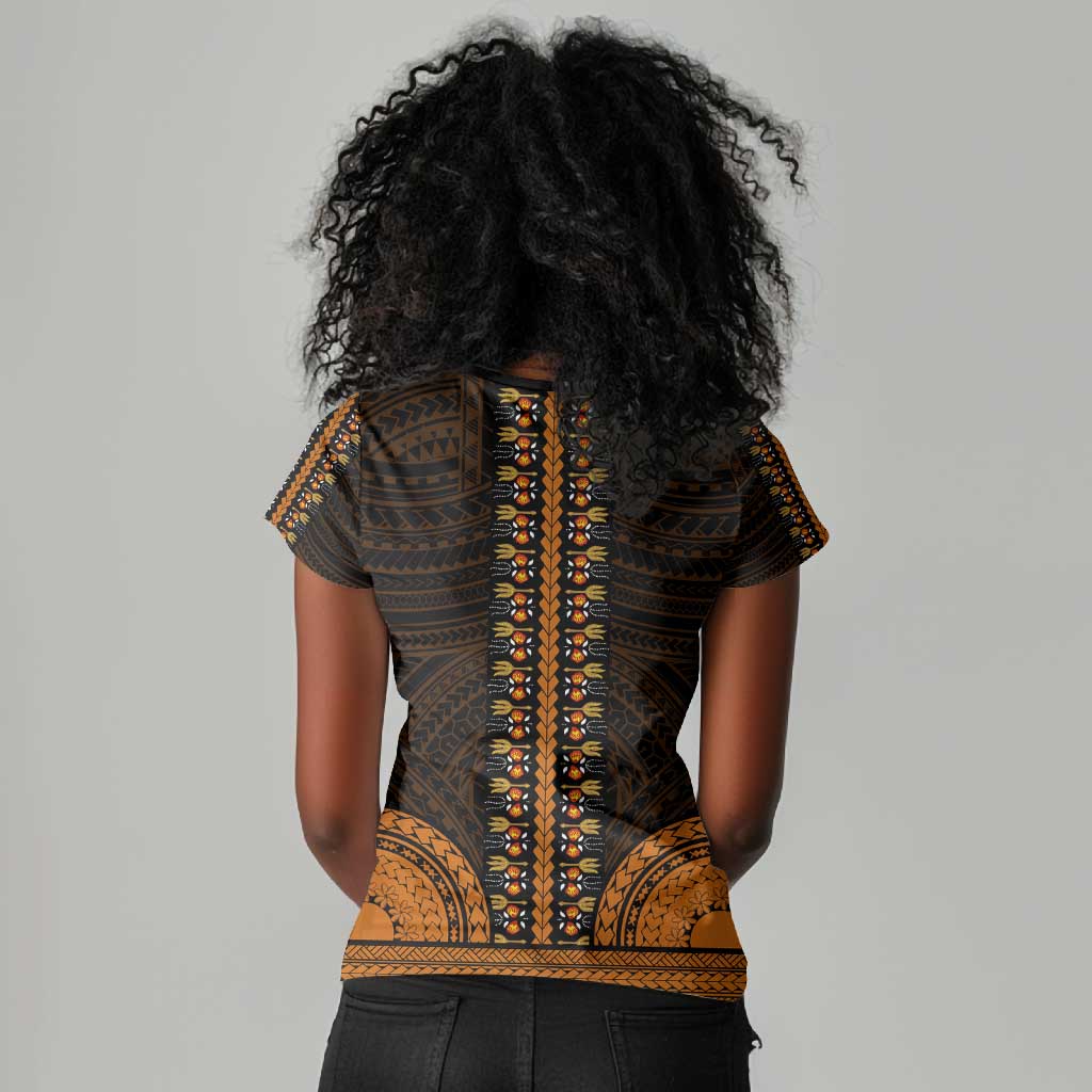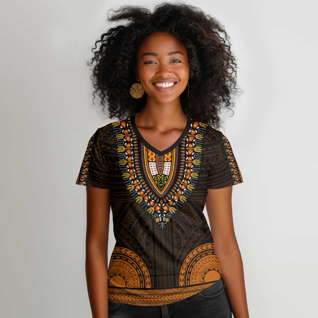 African Dashiki and Polynesian Pattern Women V-Neck T-Shirt Gold