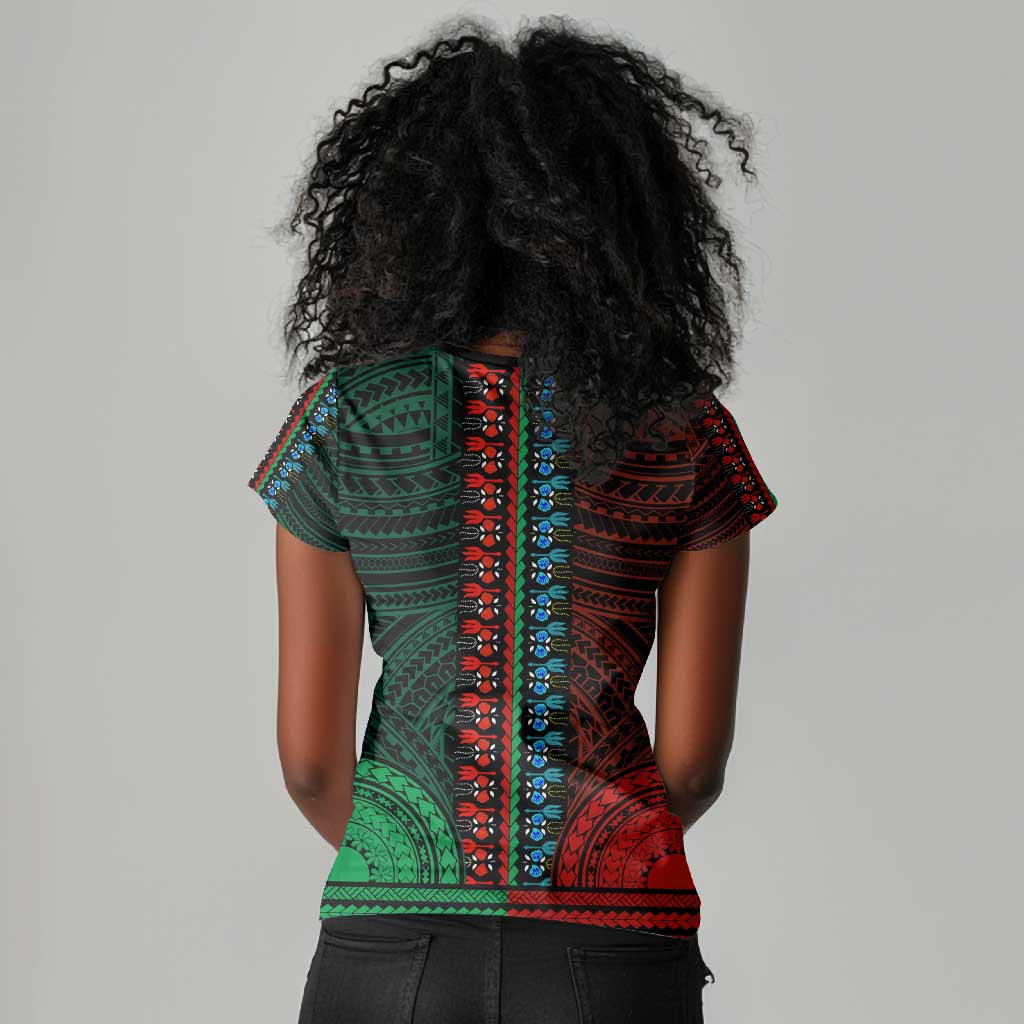African Dashiki and Polynesian Pattern Women V-Neck T-Shirt Half Green-Red