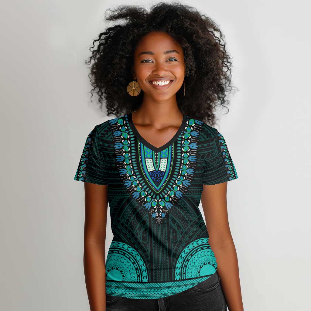 African Dashiki and Polynesian Pattern Women V-Neck T-Shirt Teal