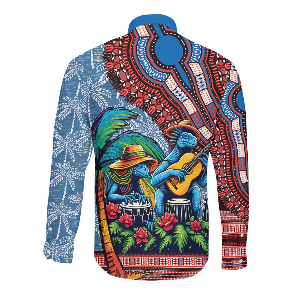 Afro-Caribbean Long Sleeve Button Shirt African Dashiki Style with Caribbean Music with Blue Iguanas