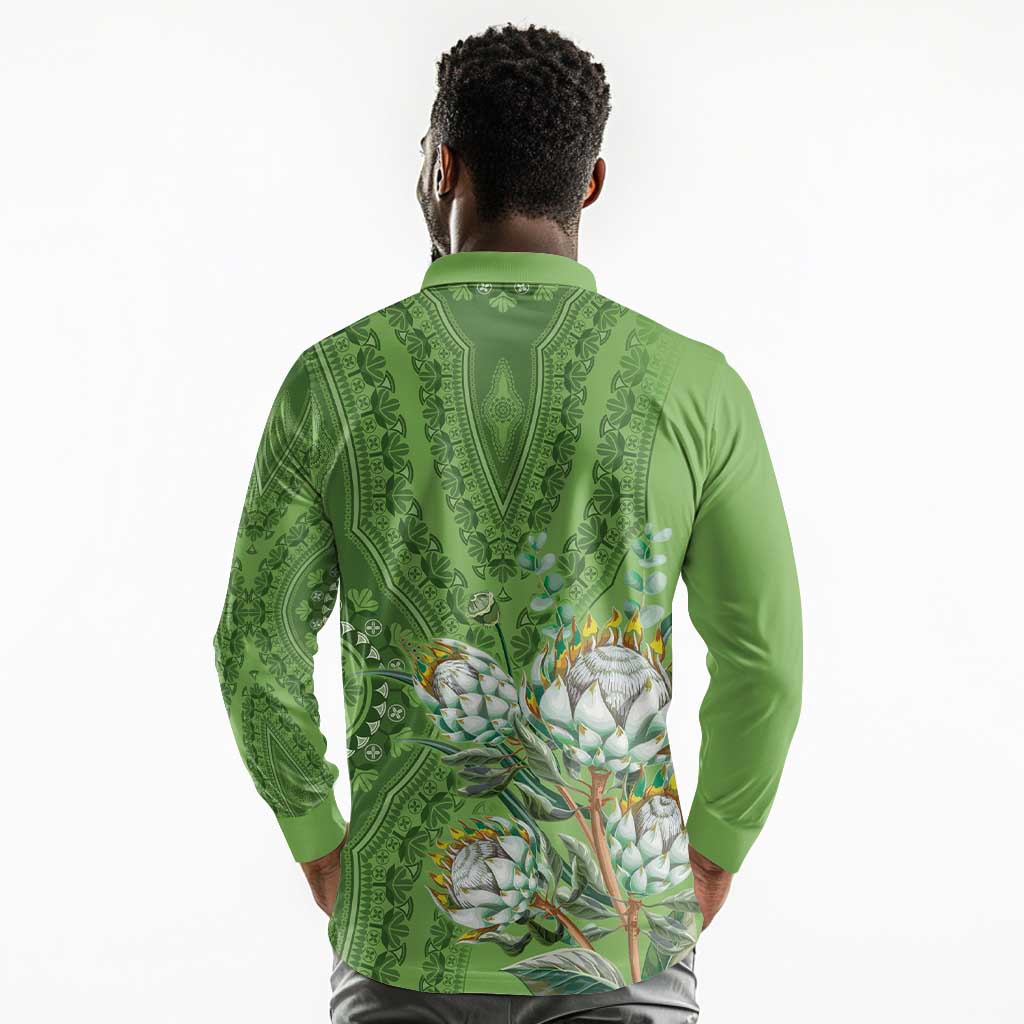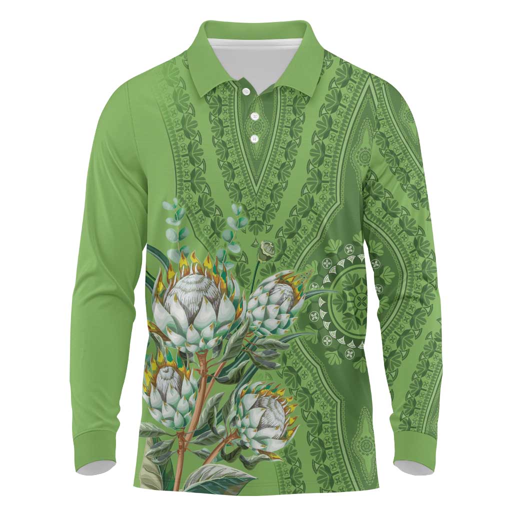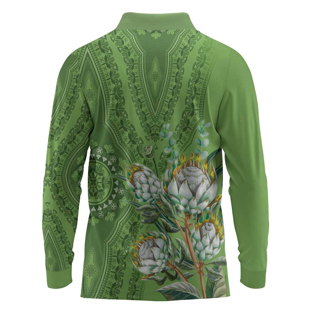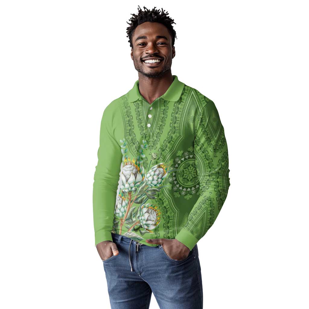 Afro King Proteas Dashiki Motif Long Sleeve Polo Shirt Green Style