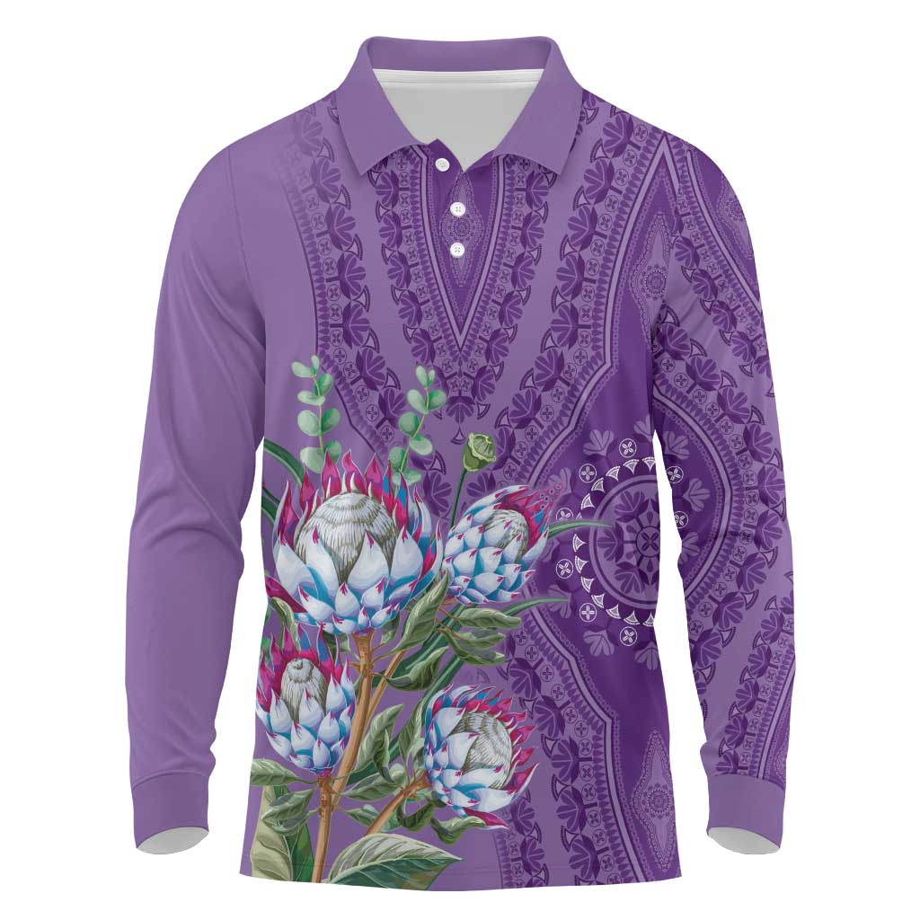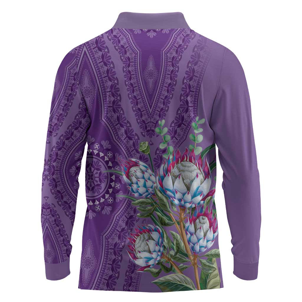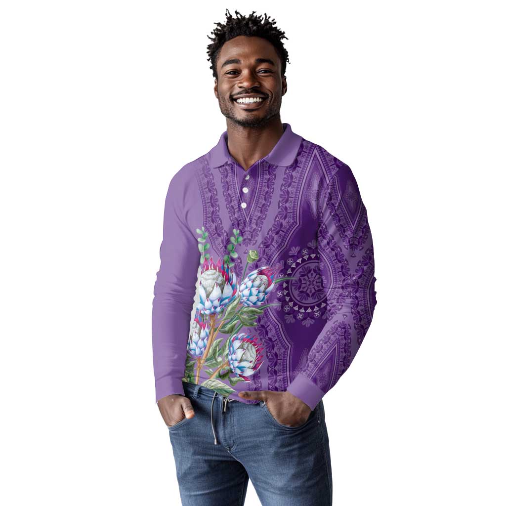 Afro King Proteas Dashiki Motif Long Sleeve Polo Shirt Violet Style