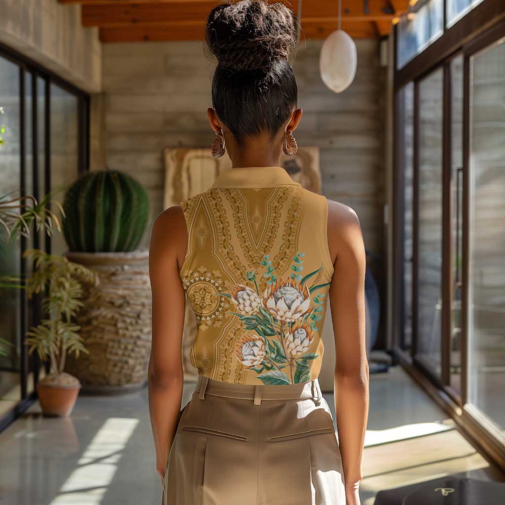 Afro King Proteas Dashiki Motif Women Sleeveless Polo Shirt Gold Style
