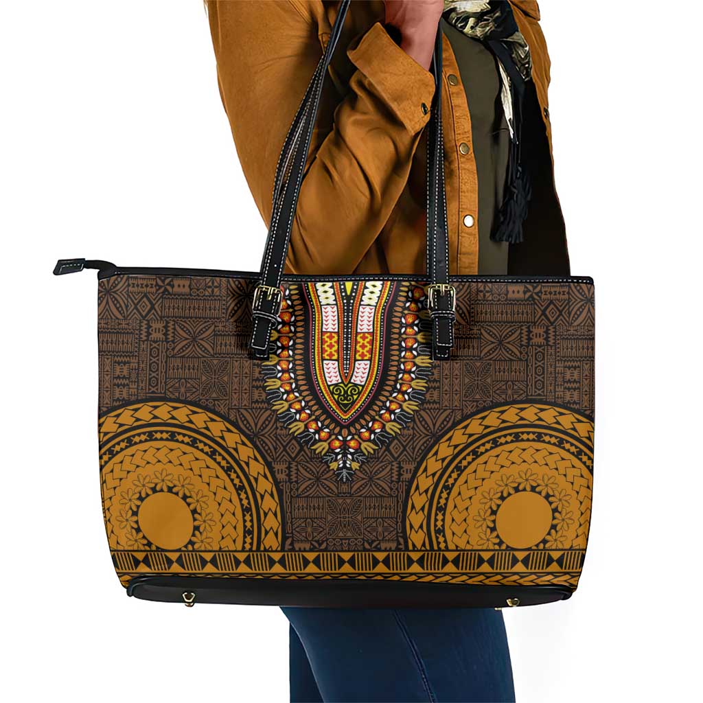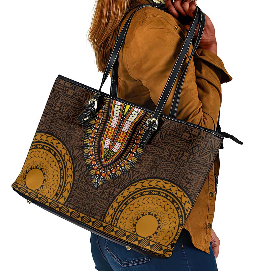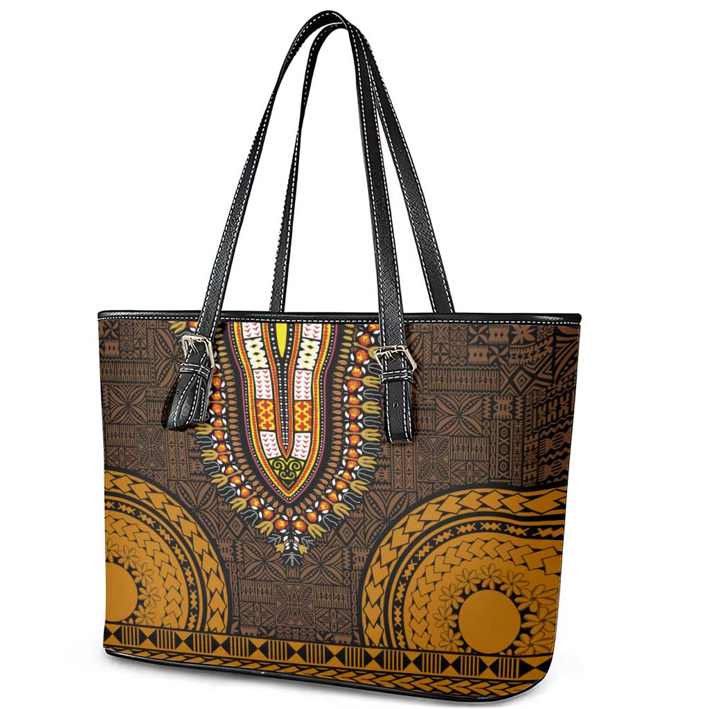 Gold Dashiki and Tapa Pattern Leather Tote Bag Africa-Polynesia Together Culture