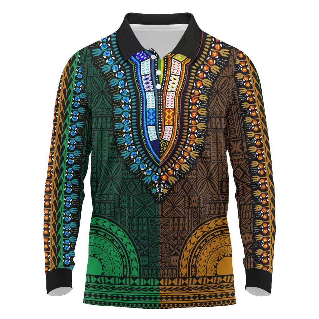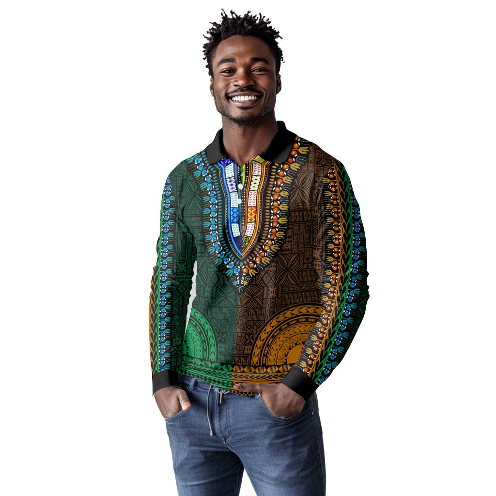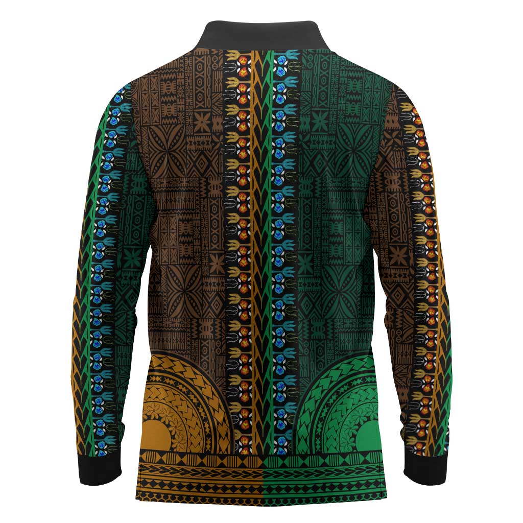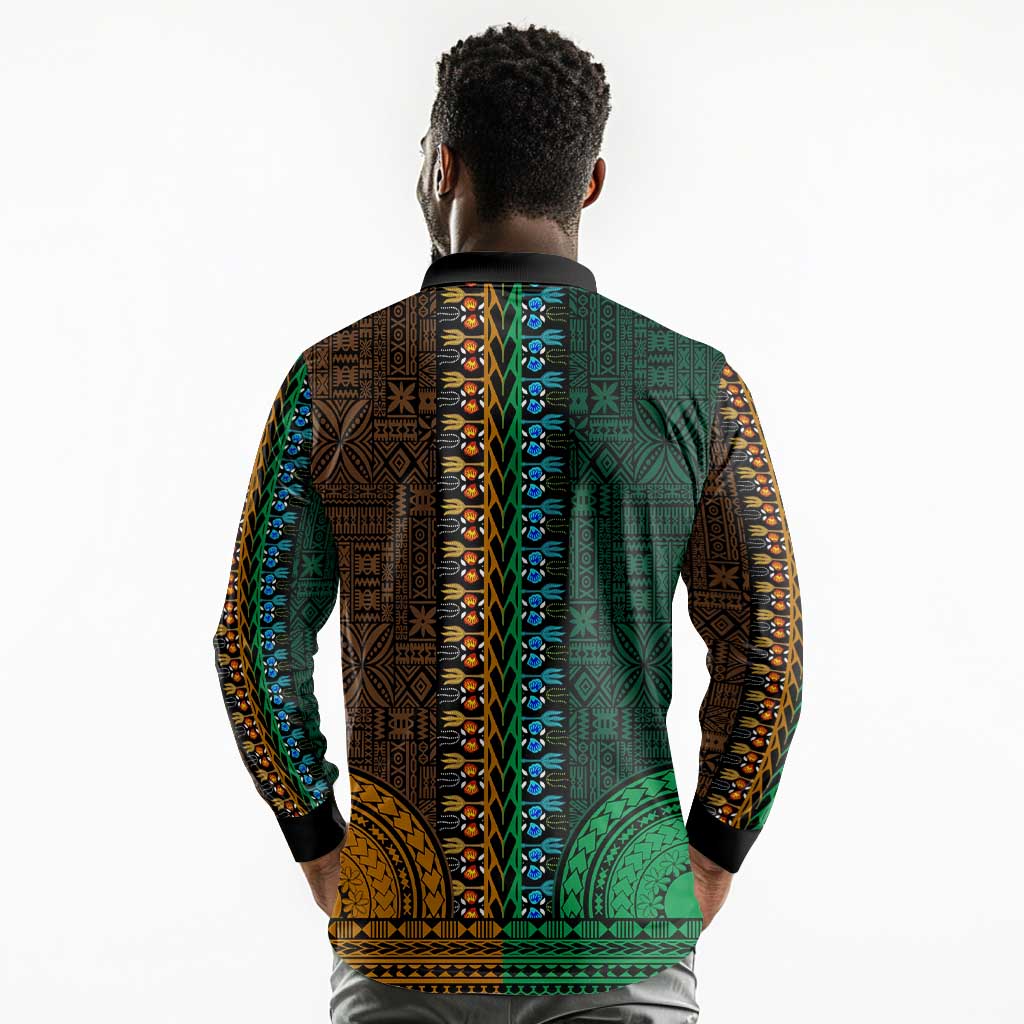 Green-gold Dashiki and Tapa Pattern Long Sleeve Polo Shirt Africa-Polynesia Together Culture
