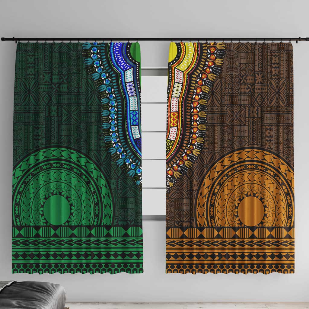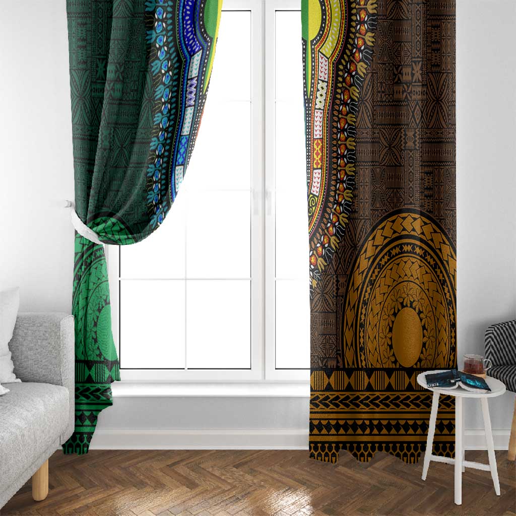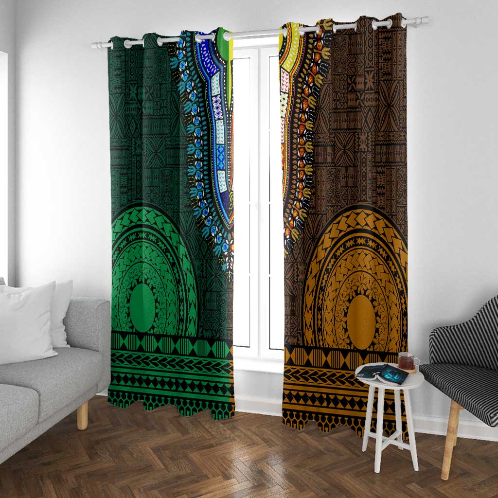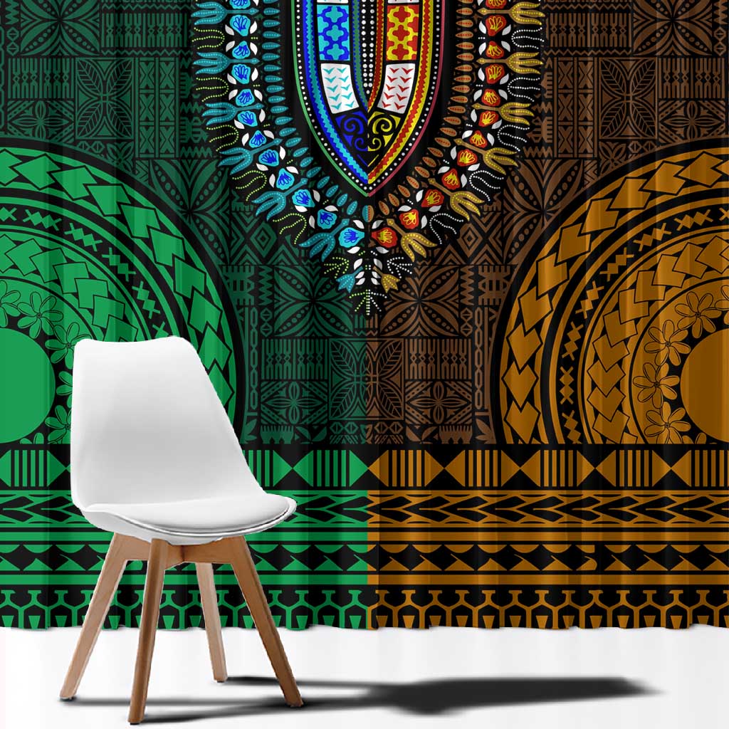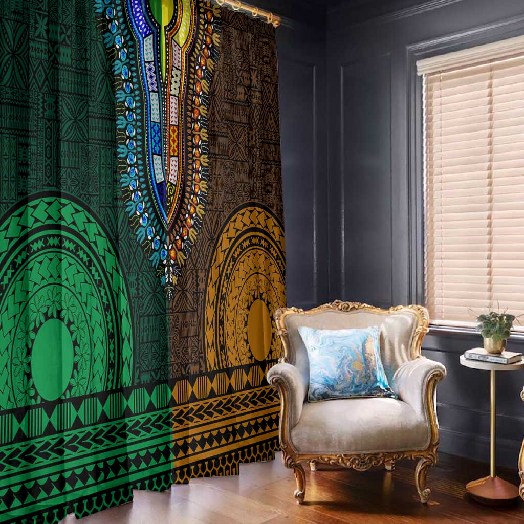 Green-gold Dashiki and Tapa Pattern Window Curtain Africa-Polynesia Together Culture