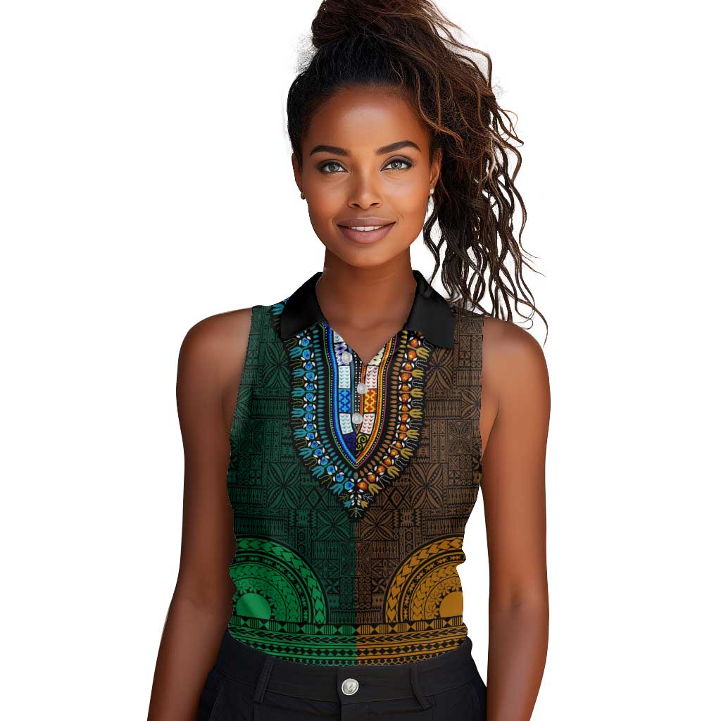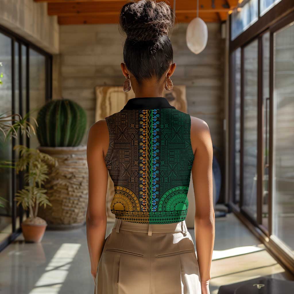 Green-gold Dashiki and Tapa Pattern Women Sleeveless Polo Shirt Africa-Polynesia Together Culture