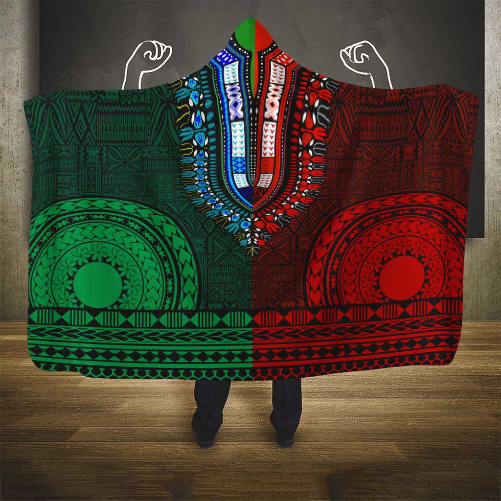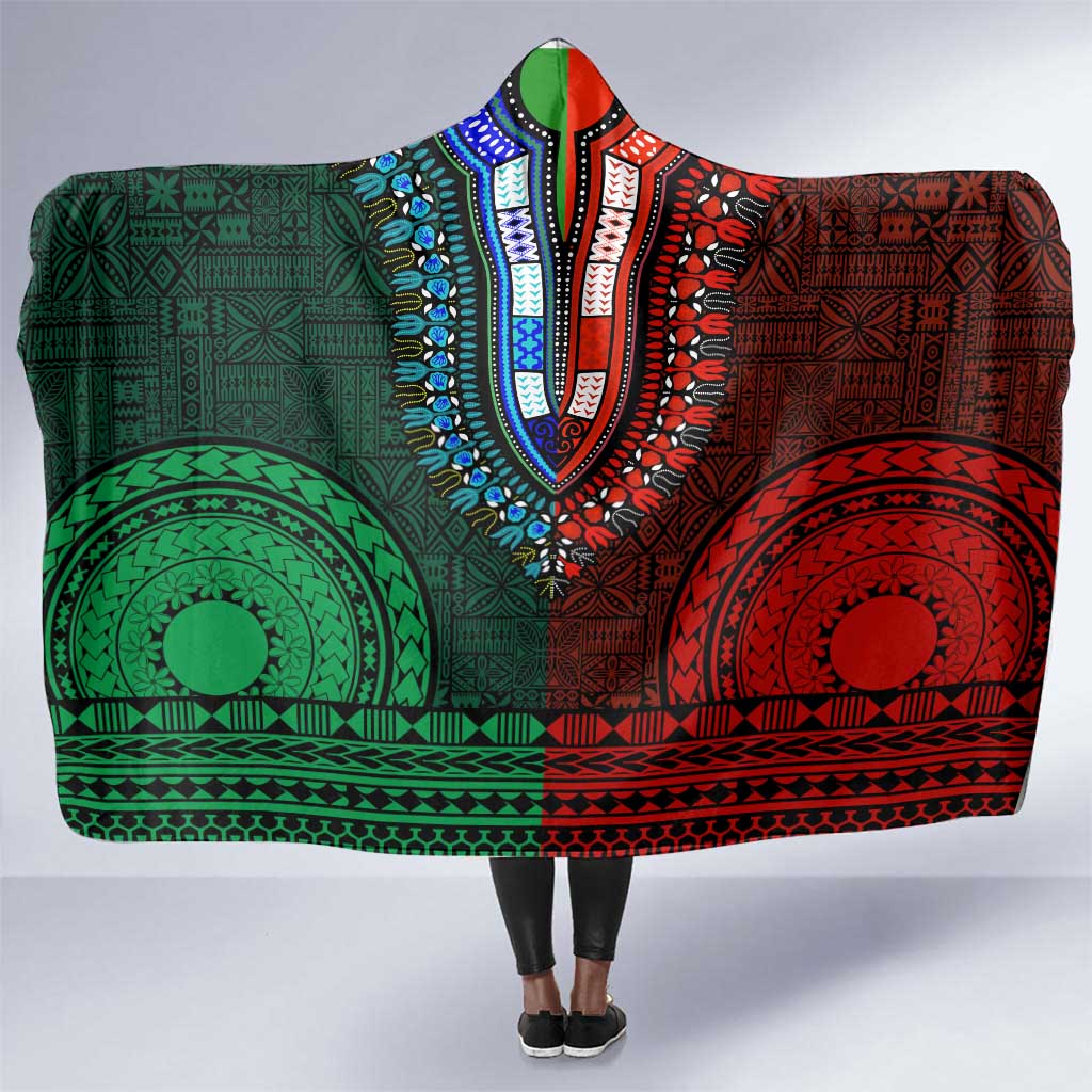 Green-red Dashiki and Tapa Pattern Hooded Blanket Africa-Polynesia Together Culture