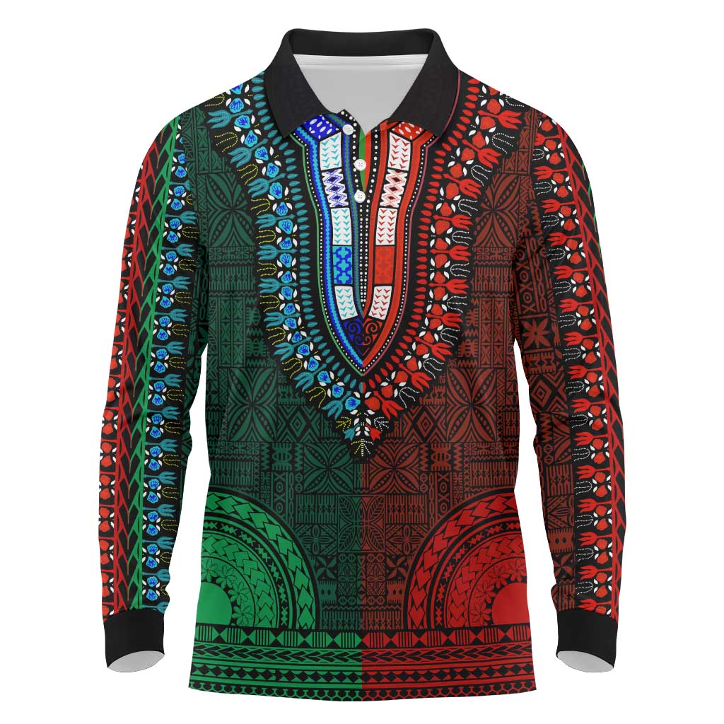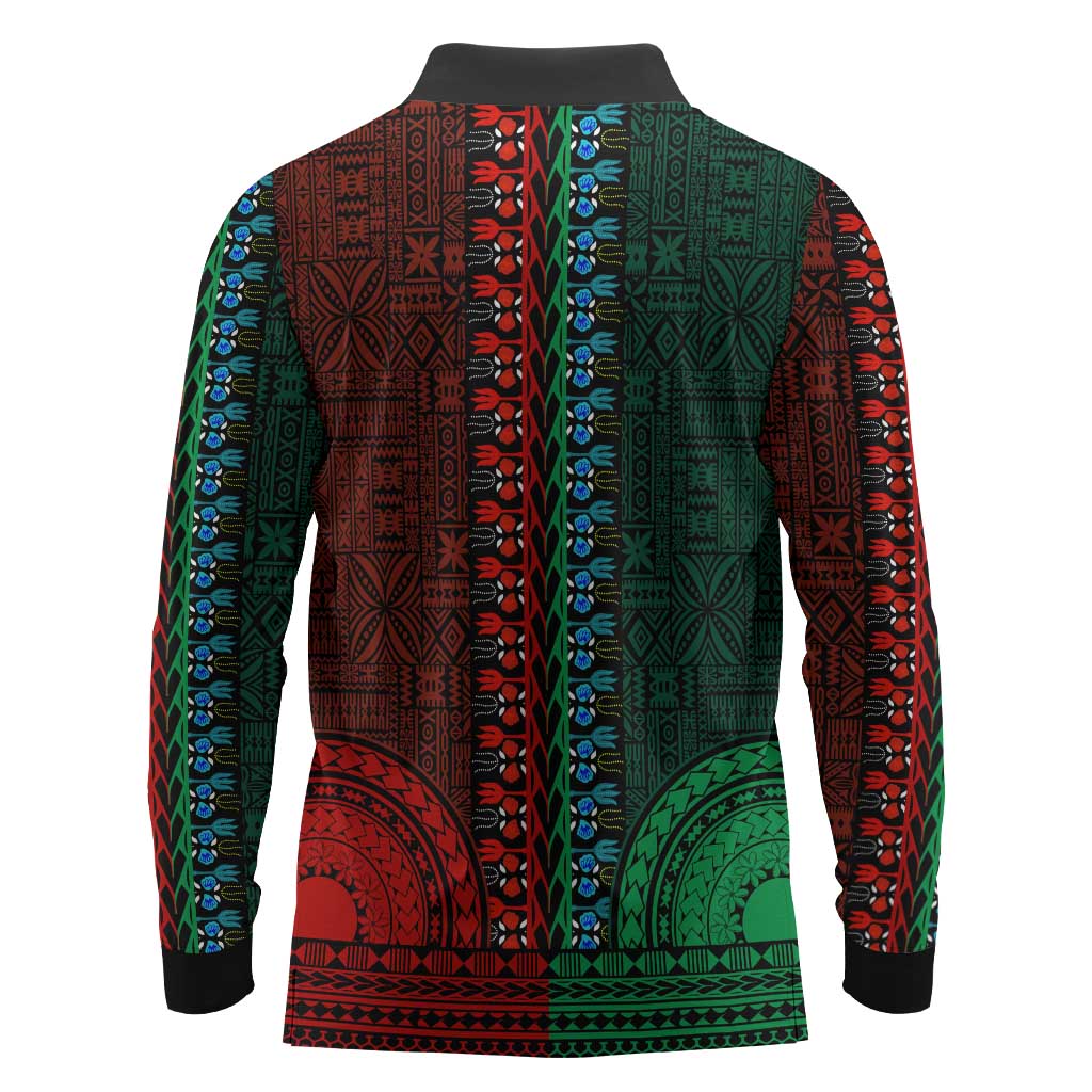 Green-red Dashiki and Tapa Pattern Long Sleeve Polo Shirt Africa-Polynesia Together Culture