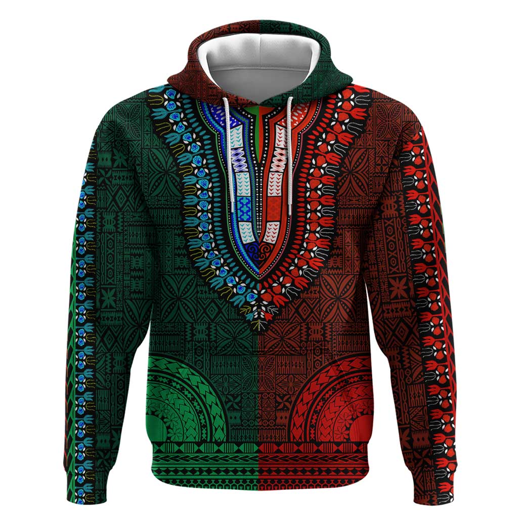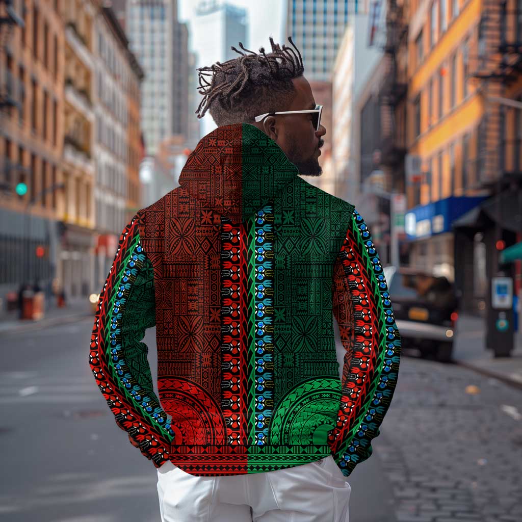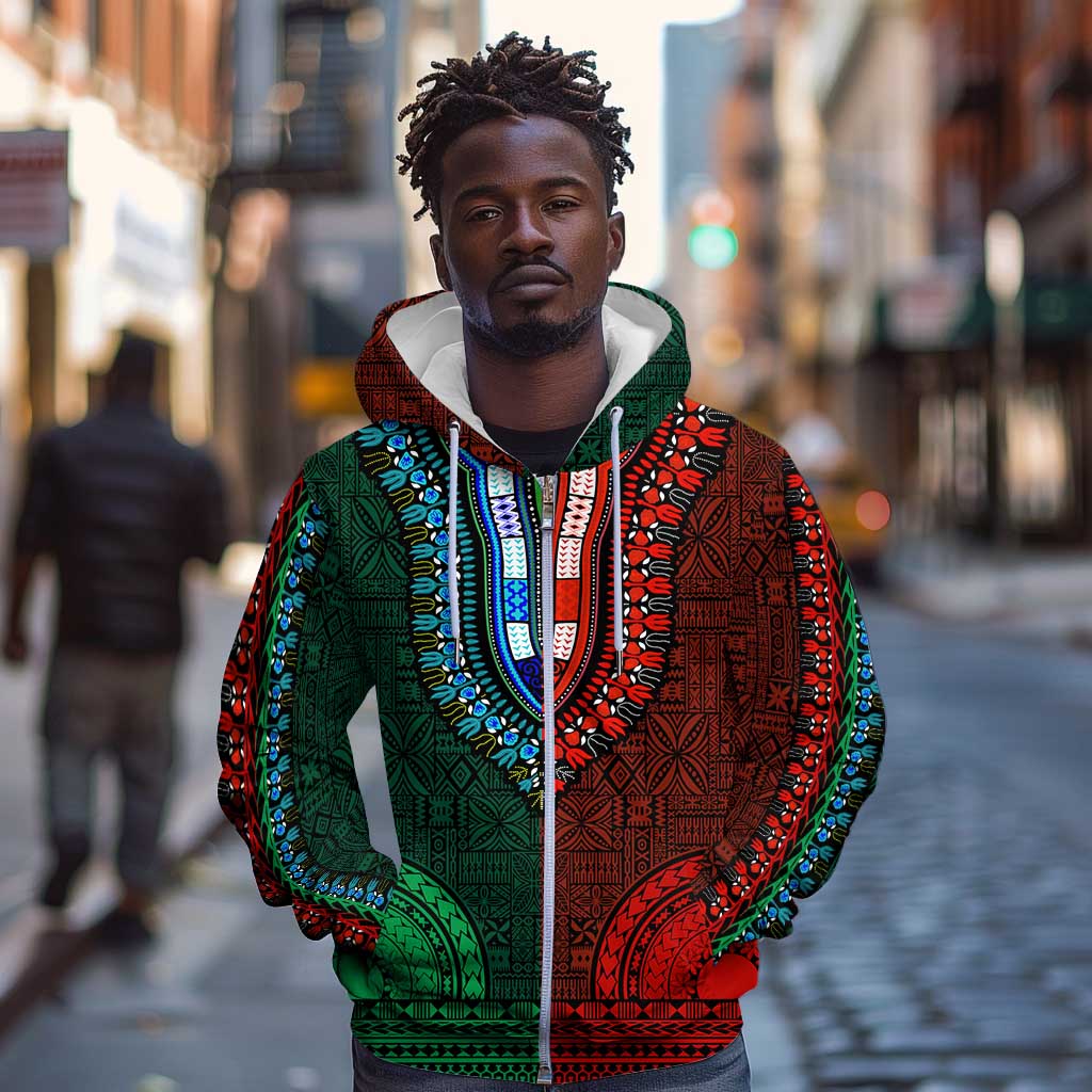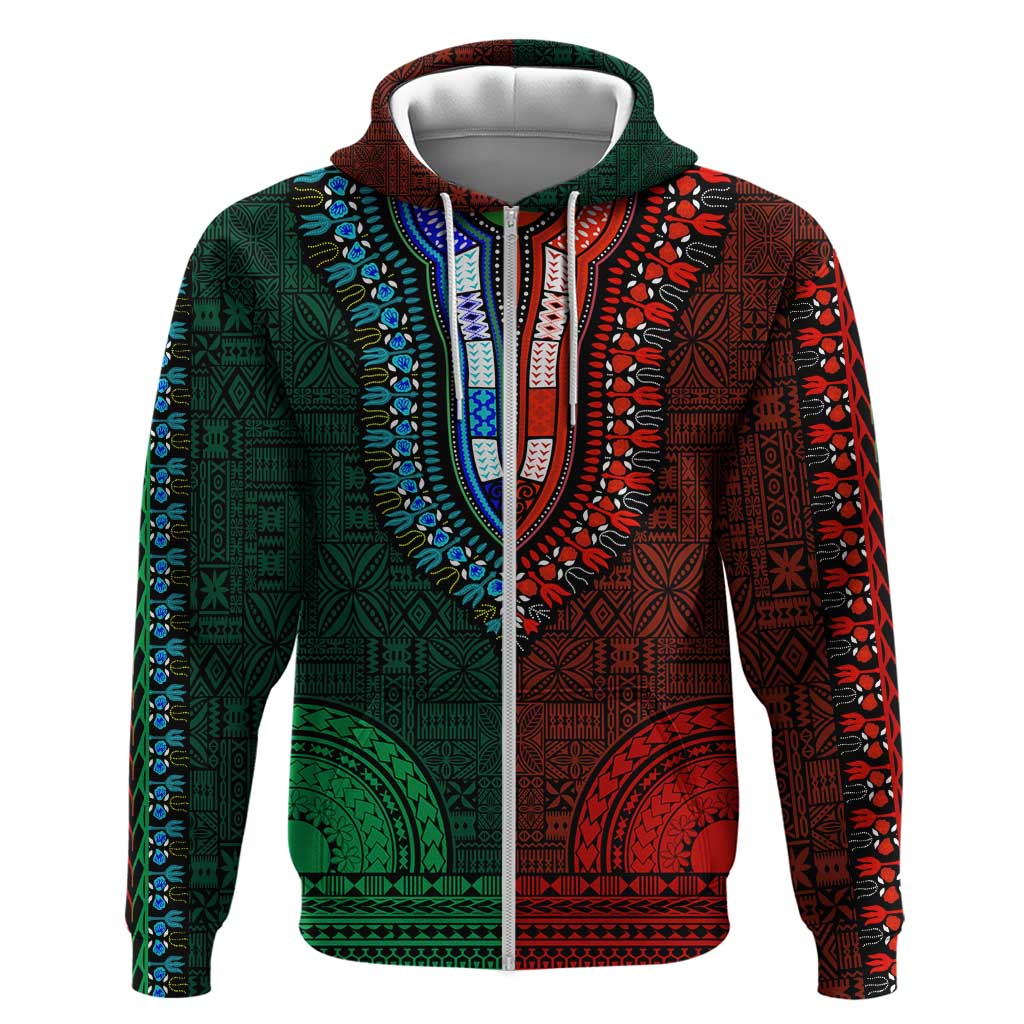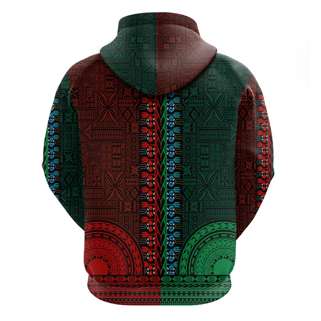 Green-red Dashiki and Tapa Pattern Zip Hoodie Africa-Polynesia Together Culture