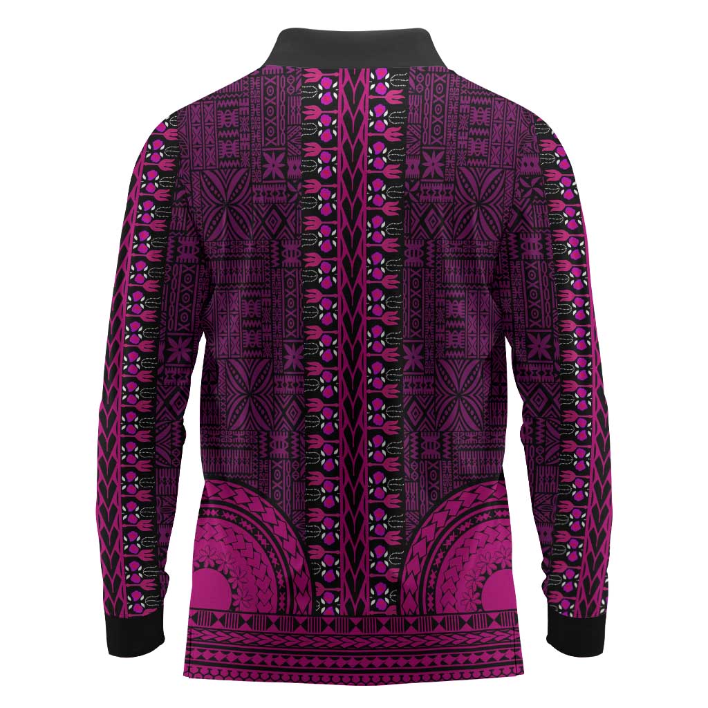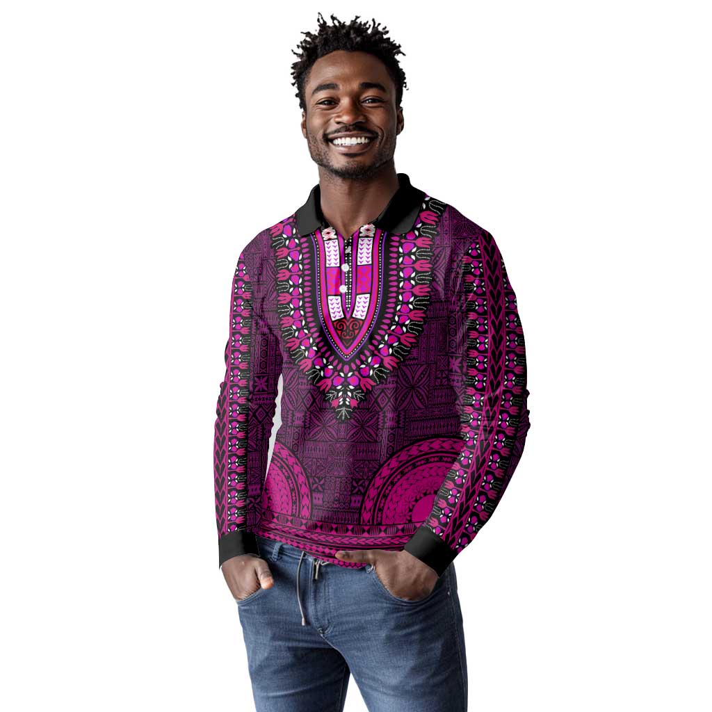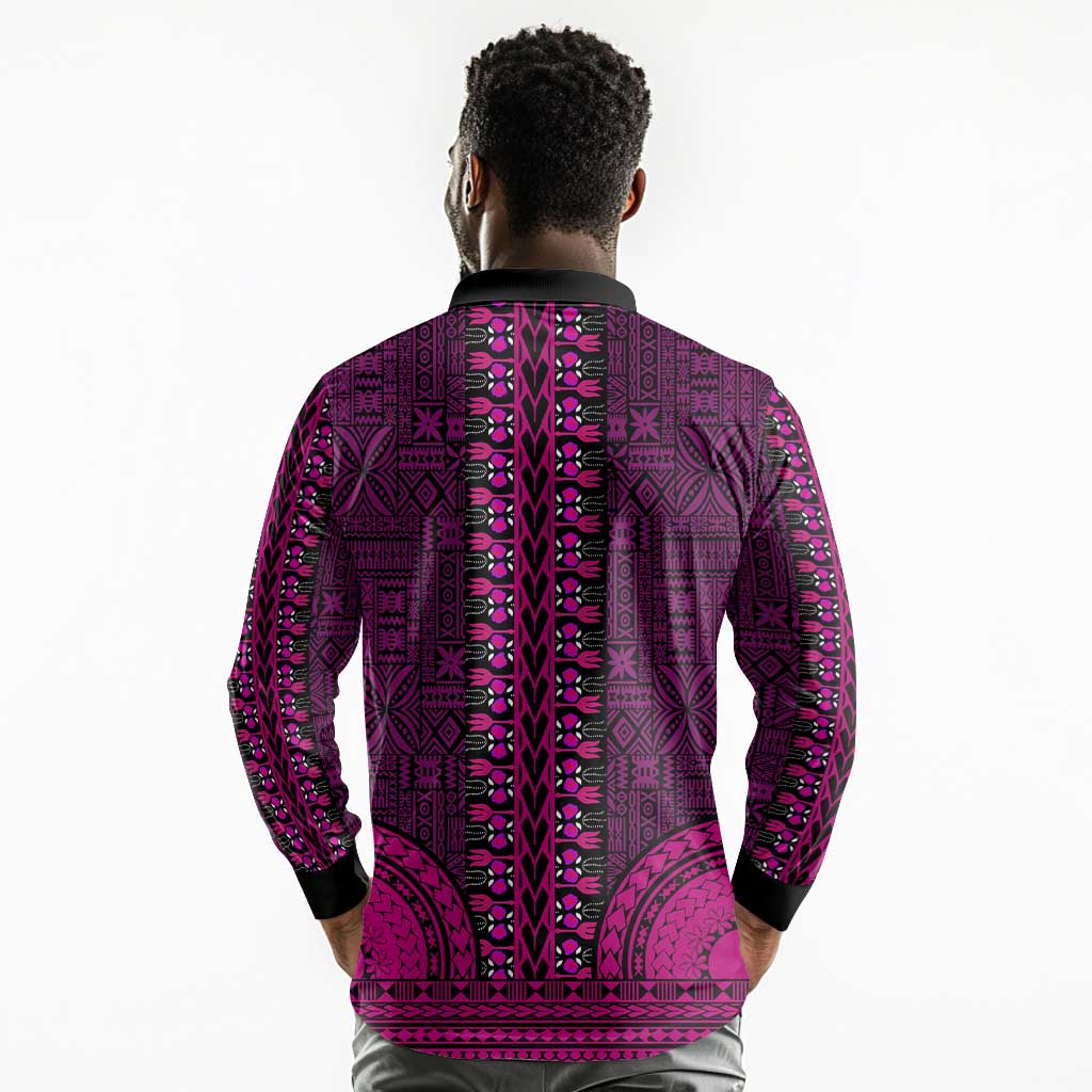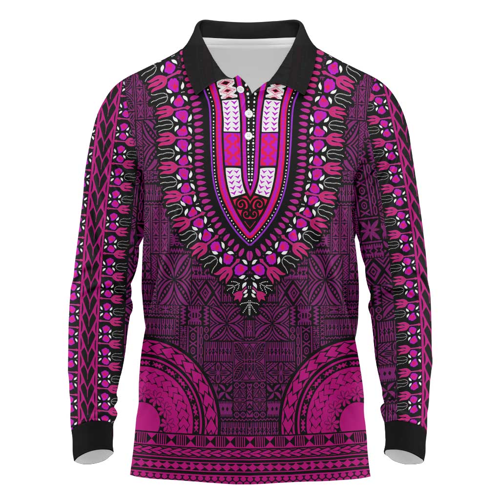 Pink Dashiki and Tapa Pattern Long Sleeve Polo Shirt Africa-Polynesia Together Culture