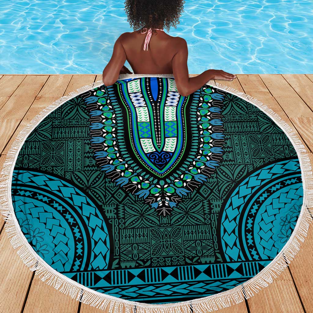 Teal Dashiki and Tapa Pattern Beach Blanket Africa-Polynesia Together Culture