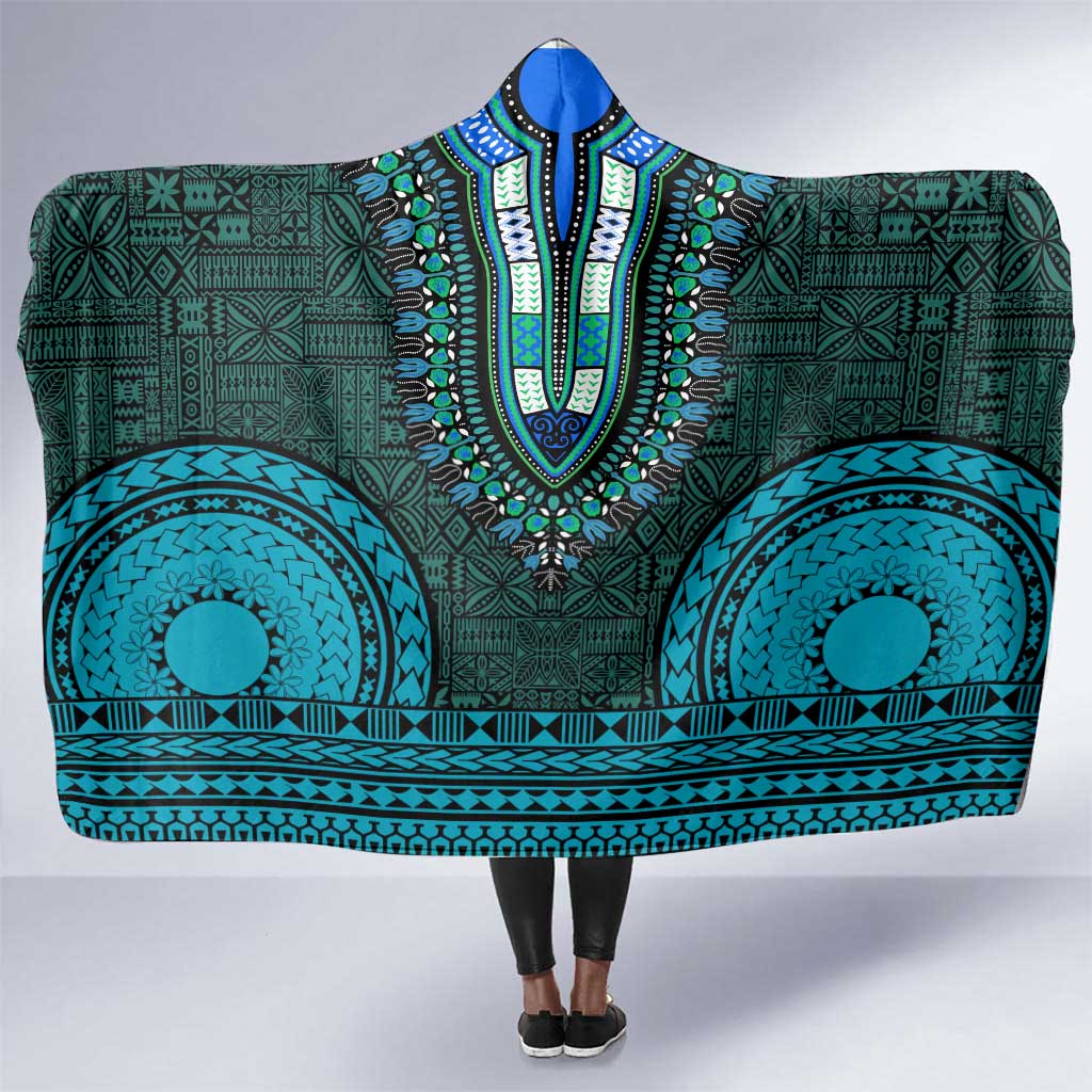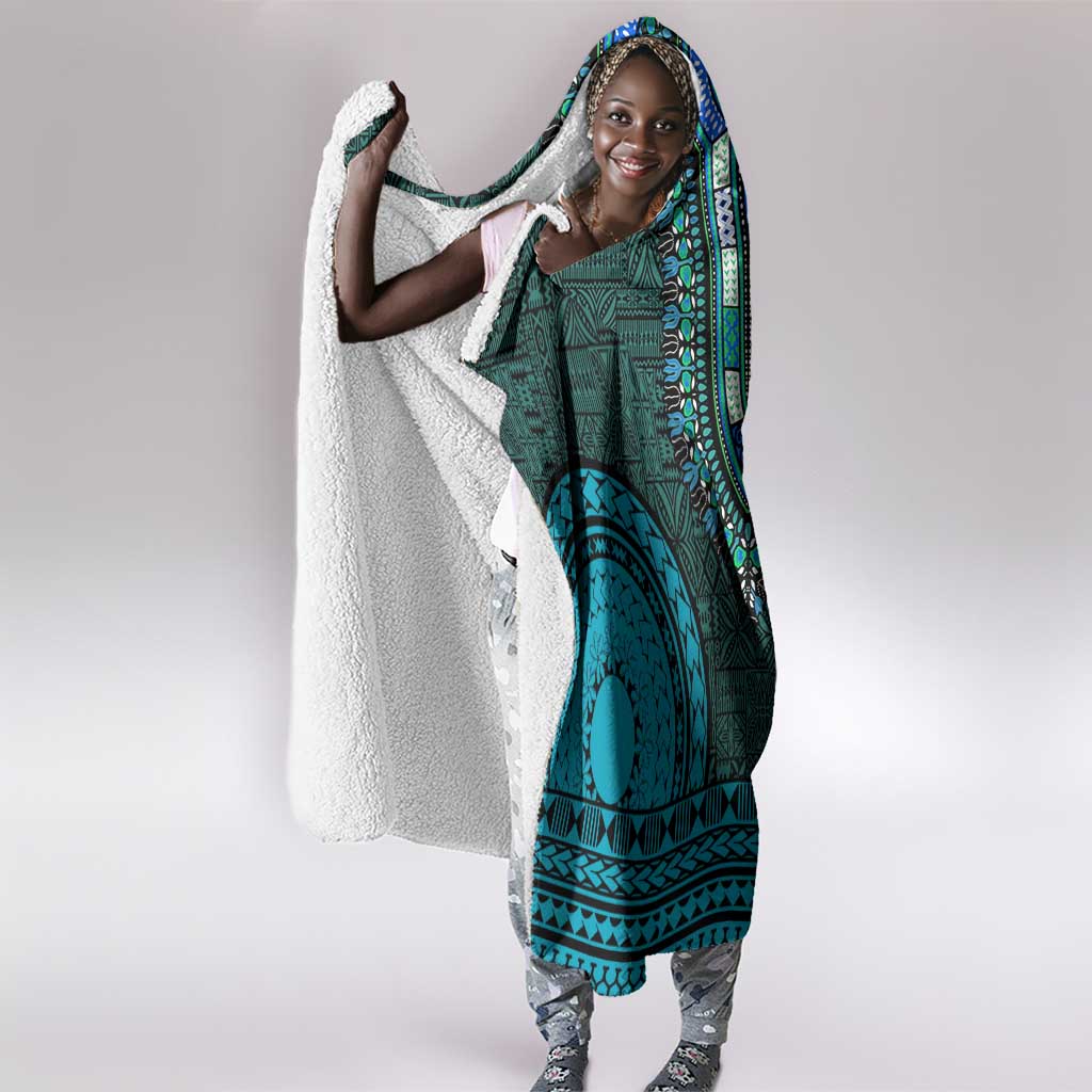 Teal Dashiki and Tapa Pattern Hooded Blanket Africa-Polynesia Together Culture LT9